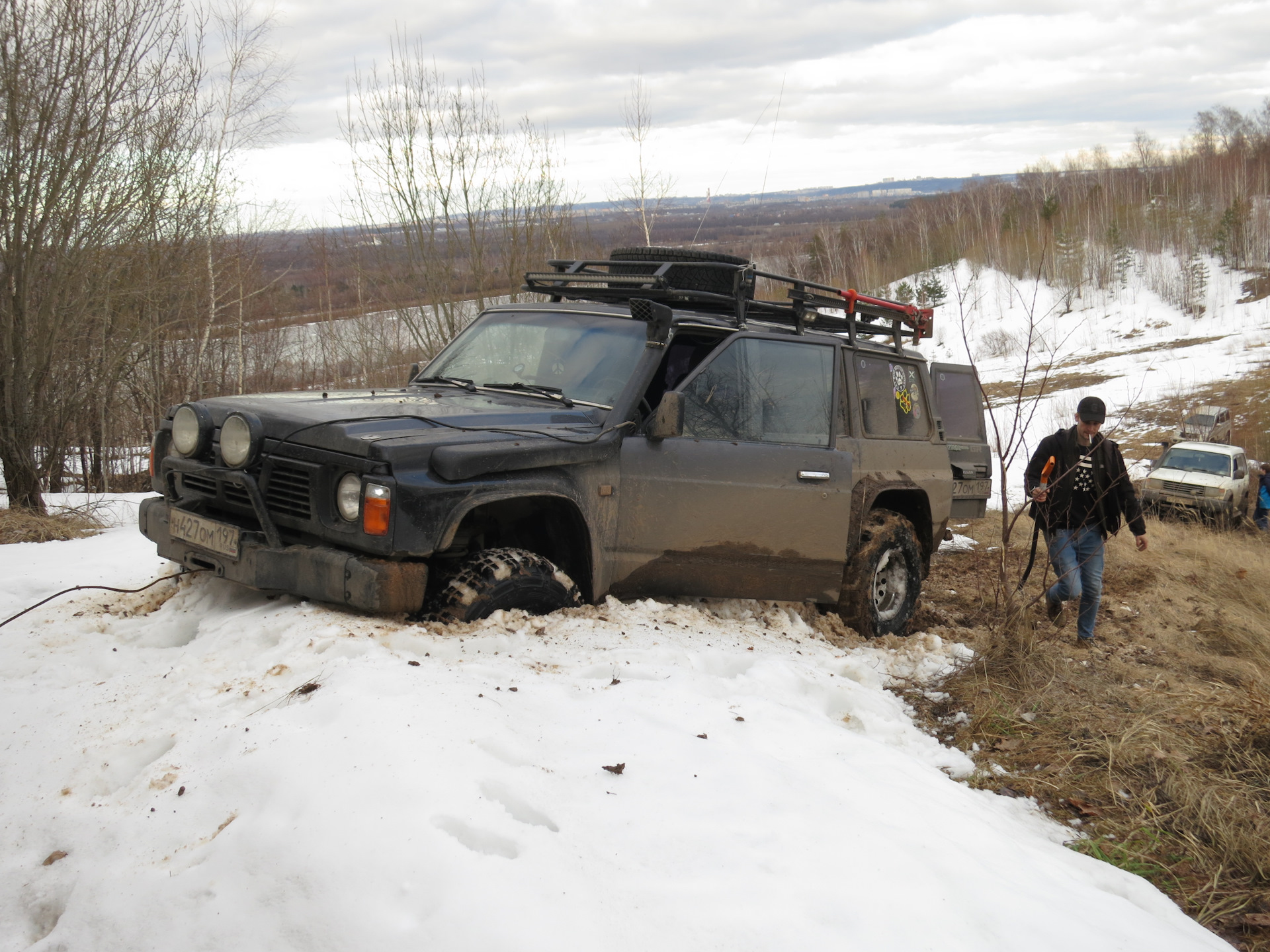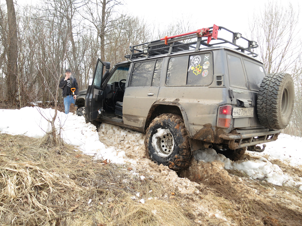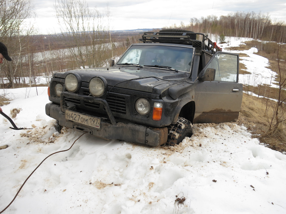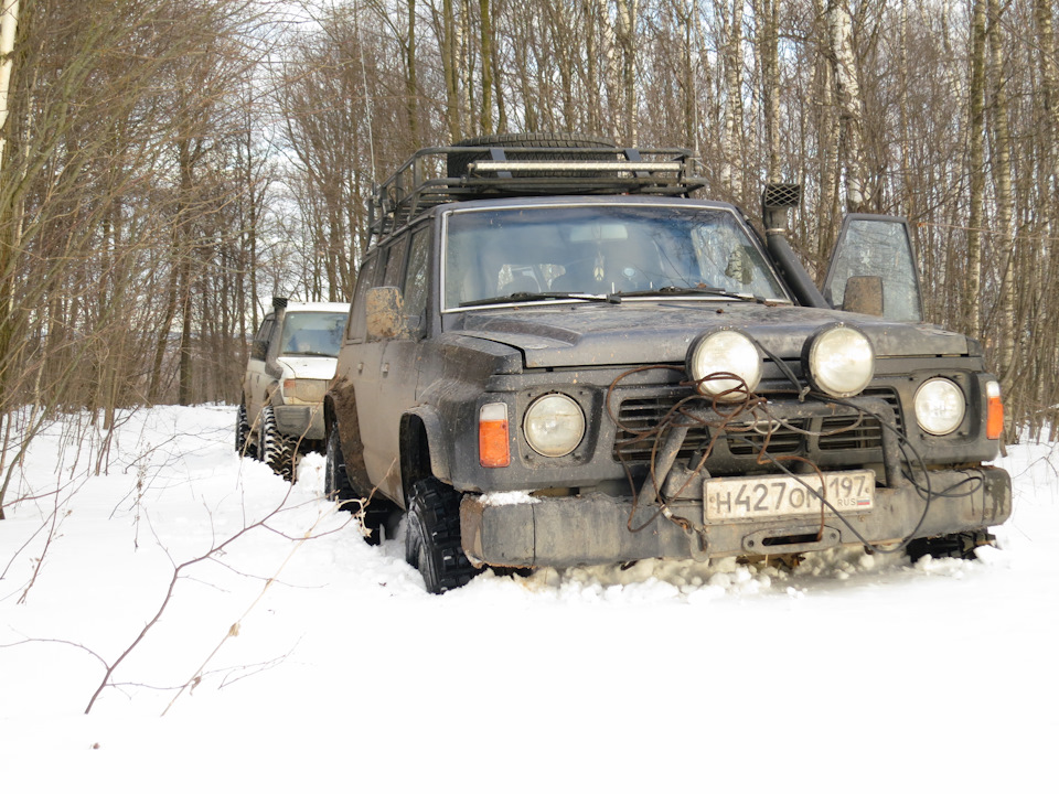 Первым попробовал свои силы Падж, однако снег ему не дался. Решили откатить его назад и пустить вперед Патруль. Собственными силами и он не смог сначала заехать — снег был очень глубокий со льдом.
