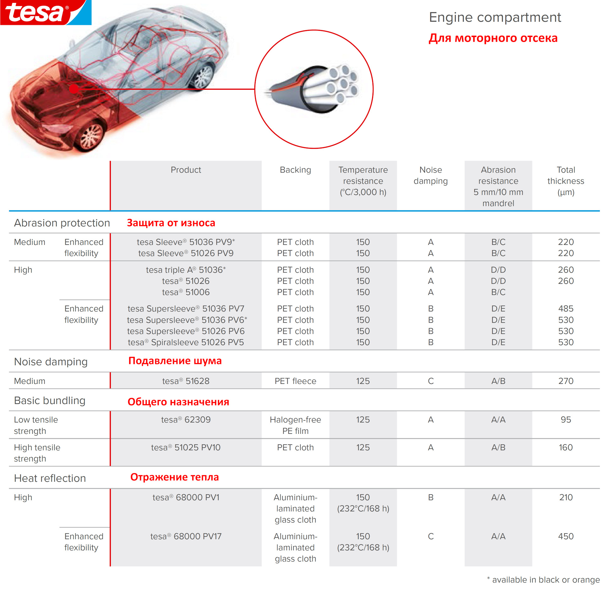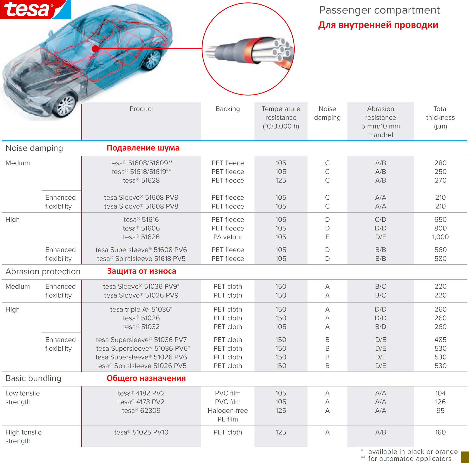 Є тканинна ізолента для підкапотних робіт (термостійкість 150 градусів) та ізолента для салонних робіт (велюрова).