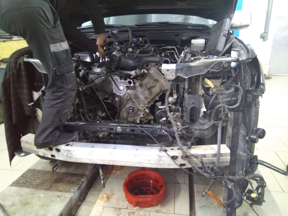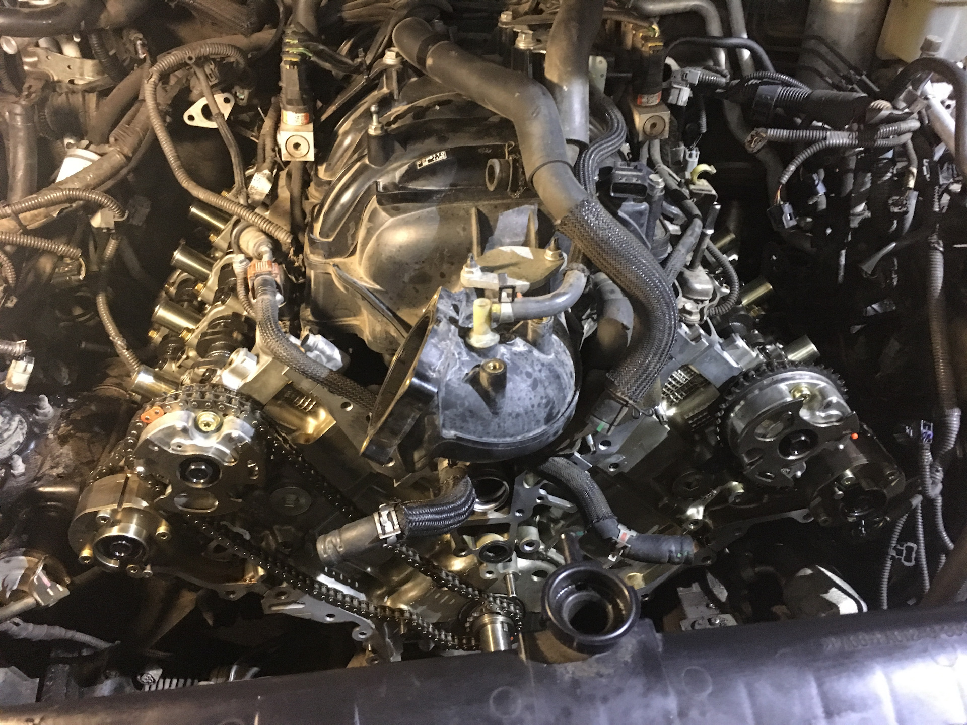 В этот раз к нам приехал Lexus lx570 2010 года, проблема связана с шумом в районе ГРМ. Как известно Lexus, тем более в "костюме" двухсотки не совсем простая машина, мы уже сталкивались с ремонтом в основном по подвеске, теперь работа с ГРМ. В таких случаях мы не стараемся заниматься данной работой, другое дело наш профиль подвеска, но в этом случае отказаться не получается, особый клиент. И так проблема заключается в появлении шума при работе двигателя, шум схож на небольшой треск, шум не постоянный, более явно прослушивается на прогретом двигателе. При подключении сканера ошибок связанных с работой фаз нет, шум только в районе левой головы. Клиент не так давно приобрел данный авто и объяснил, что цепи недавно были заменены прежним хозяином.