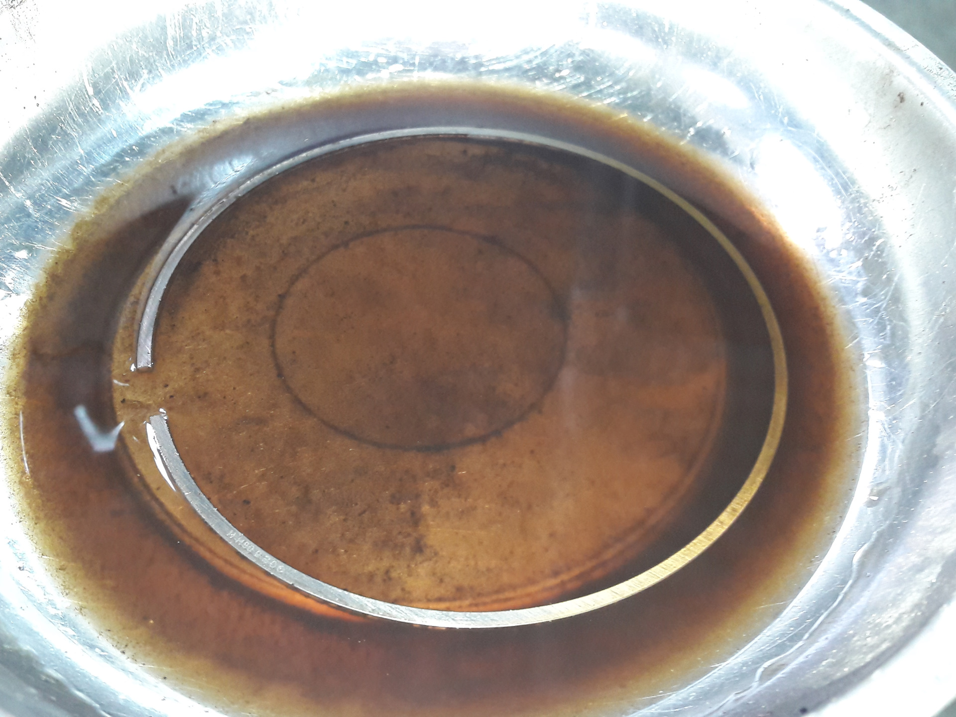 Увидев данную картину, я попросил клиента найти у себя в гараже остатки GZoxа и предоставить их мне для того, чтобы понять, стоит ли игра свеч. Маслосъёмное кольцо было снято с поршня и отправлено купаться в очиститель. Как Вы можете наблюдать по фото, результат нулевой. Очистить дренаж кольца удалось только сжатым воздухом.