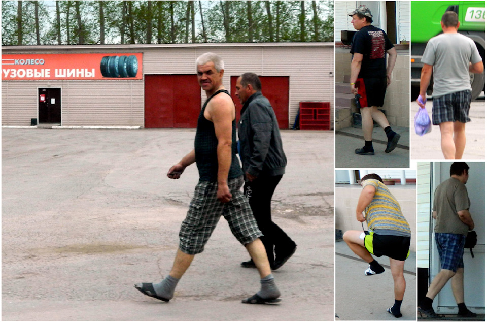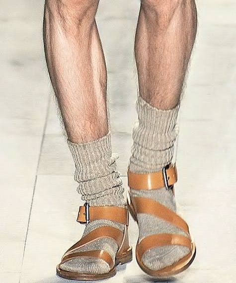 — длина носка, его облегаемость – мужчины по привычке натягивают носок высоко (как под брюки). Высокий носок делает комбинацию носка-сандалии аналогом сапога. А длинный облегающий "сапог", сомнительных цветовых сочетаний, из ужасного качества материалов диссонирует с ворсистой мужской конечностью.