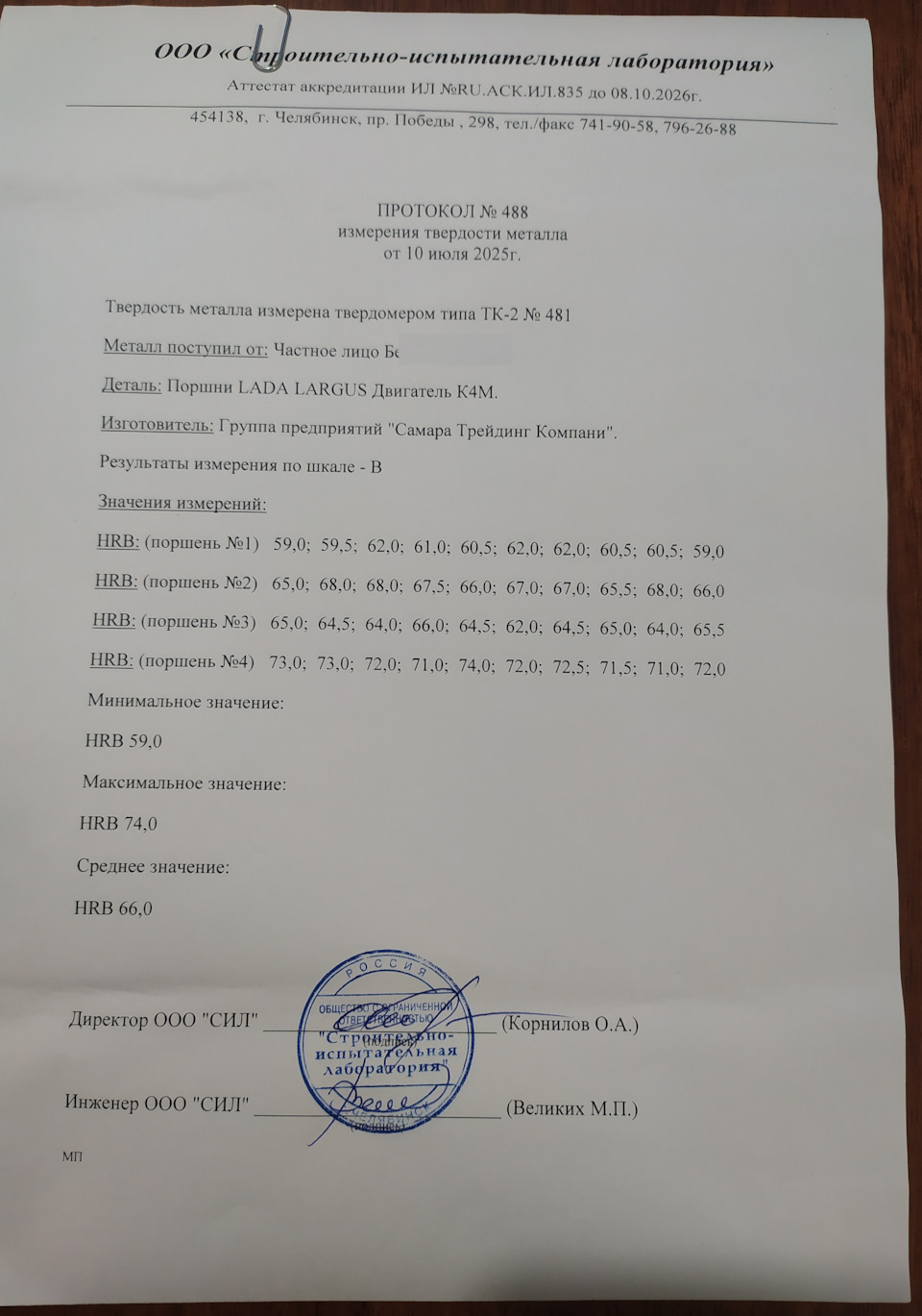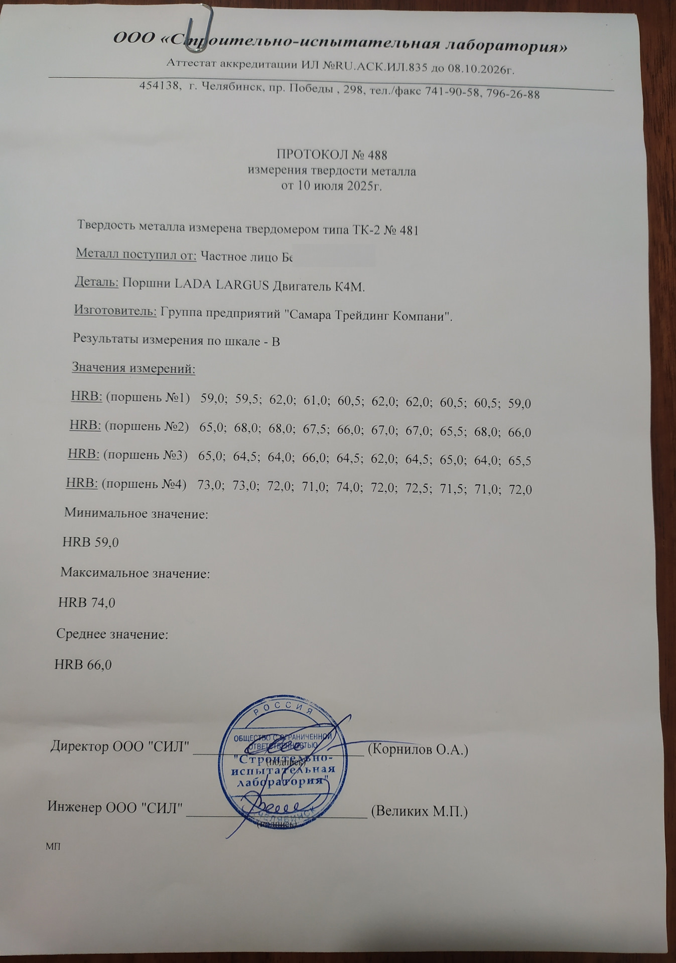 Для определения твердости металла поршни были отданы в строительную лабораторию на твердомер.
