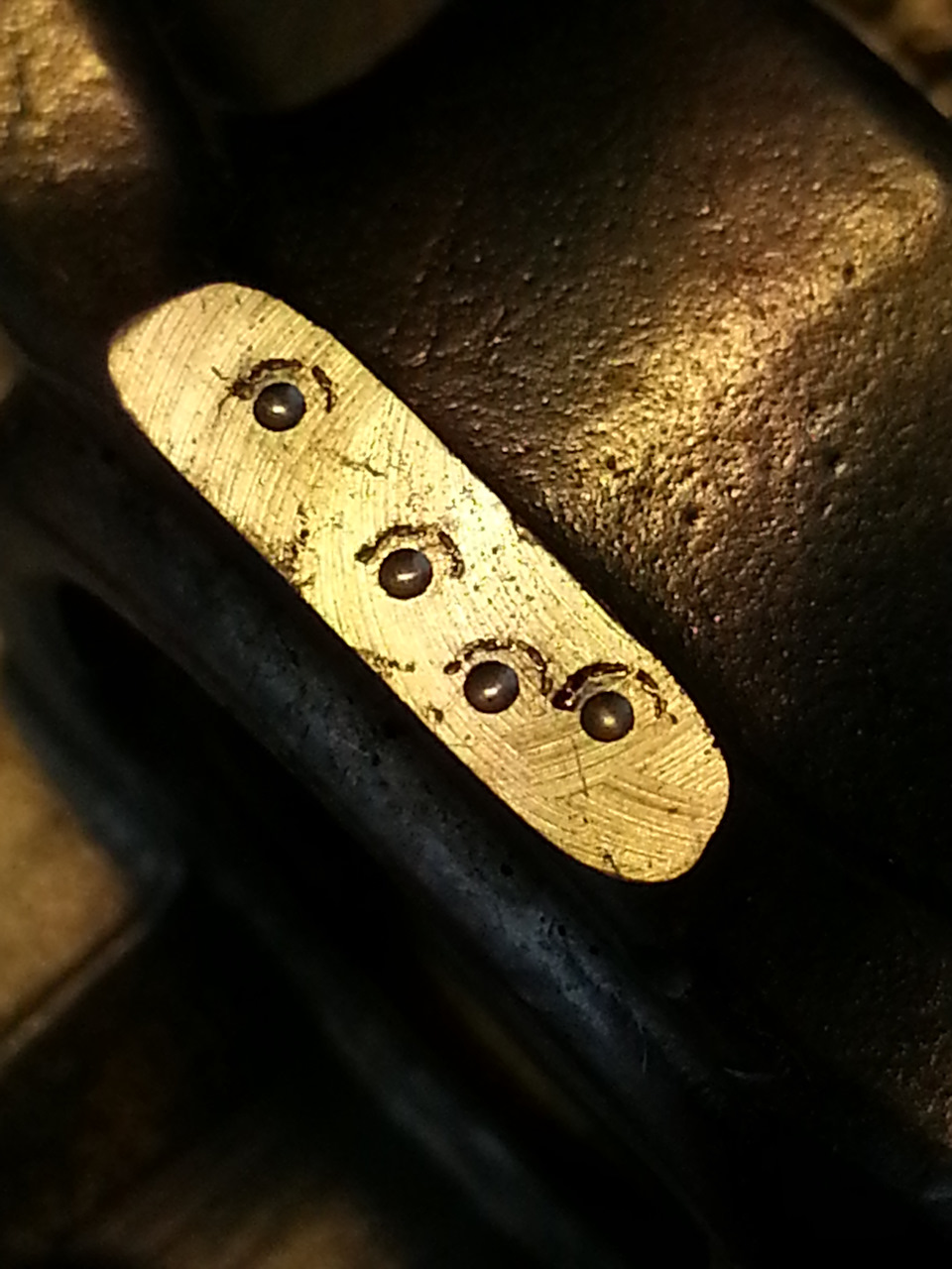 На поршнях СТК измерительный шарик вдавился в металл до оправки – ее следы видны на поверхности в форме полумесяца на всех (!) замерах. Метал продавливался как пористая губка – по краям отметок нет наплывов металла (буртиков) – он не выжимался из-под шарика.