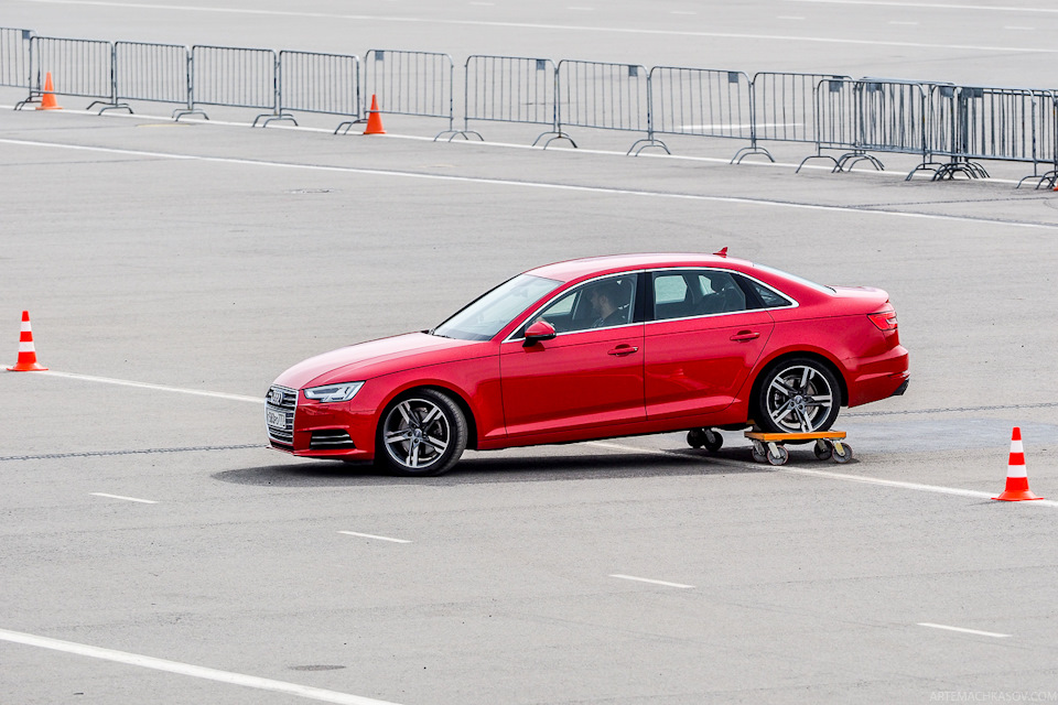 Но на самом деле, удивляться не стоит. Ведь ехал я не на обычном автомобиле, а на специальном тренажере, подготовленном школой Евгения Васина. Под задние колеса переднеприводного Audi A4 подставлены тележки — примерно, как в супермаркете, только побольше и покрепче.