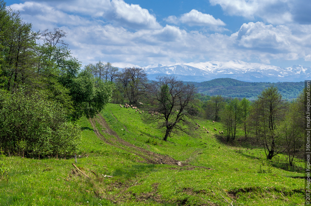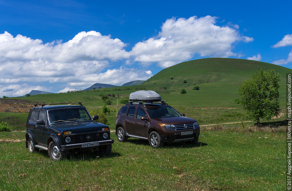 02. Андрей dron285 с Ириной на Шкода Йети решили ехать по трассе (по клику откроется яндекс-карта) через Майкоп, Лабинск, Армавир, Невинномысск и Минеральные Воды. То есть через относительно крупные города и, увы, степь. Я же приехал в горы и хотел больших гор и побольше. Поэтому мы поехали южнее (по клику откроется карта), после Майкопа и Лабинска ушли на Псебай, Карачаевск и Кисловодск. Ко мне и Лене присоединился экипаж Нивы во главе с Пашей phoboz. Этот путь сам по себе длиннее на 20 км (420 против 400), там хуже дорожное покрытие, но какая, на фиг, разница, когда вот же они уже начинаются — ГОРЫ!