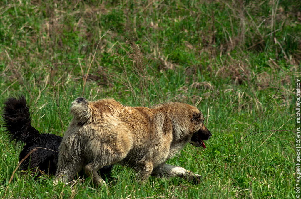 07. Начинаем возвращаться к машинам, которые остались на обочине, и замечаем, что нам наперерез бежит несколько собак. В большинстве своём беспородные шавки, но во главе с крупной кавказской овчаркой. Явно где-то рядом пасётся стадо, а псы несут свою караульную службу. Довольно сильно напрягаюсь (я вообще после нескольких укусов в детском возрасте побаиваюсь собак), берем с Пашей по большой палке с земли и медленно идем к своим машинам и навстречу к псам. Самая мелкая уже начинает предательски гавкать. Тут Ольга начинает в полный голос звать собак к знакомству и общению, кавказец уклончиво несколько раз виляет хвостом и вся свора удаляется в сторону овражка с коровьим трупом. Конфликт исчерпан.