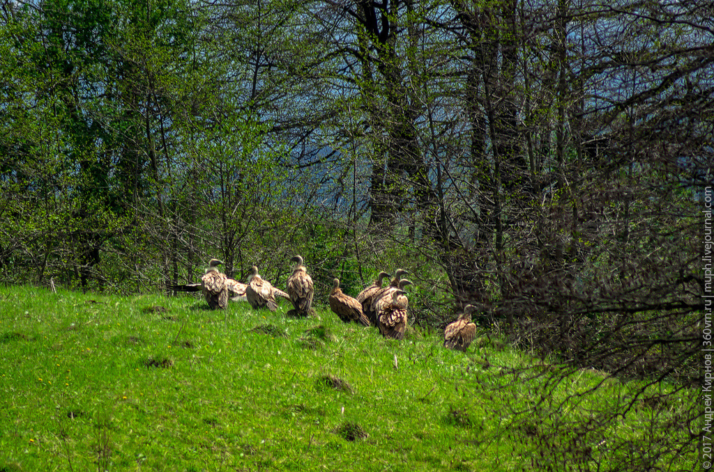 05. Погодка отличная, катим себе по дороге и крутим головами во все стороны. Справа уже видны снежные вершины Большого Кавказского хребта и это переполняет мое сердце трепетным восторгом. Вдруг замечаю какое-то движение в лесу недалеко от дороги. Останавливаемся, начинаем аккуратно приближаться и видим на пригорке несколько десятков огромных хищных птиц.