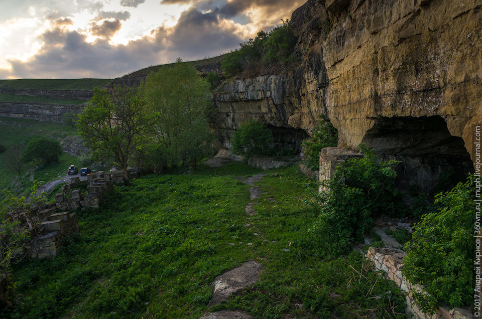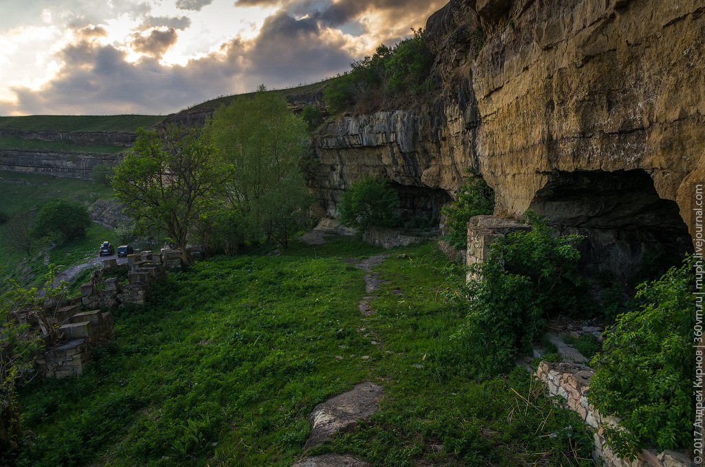 19. Уже почти на закате, при подъезде к селу Терезе в балке Хацкехар случайно находим какую-то странную крепость в скале. Решаем подняться и осмотреть. Небольшая отворотка с асфальта, паркуемся (на фото видны машины) и вот мы уже у крепостных стен. Ну как крепостных… На викимапии это место описывается так: "Развалины древнего оборонительного сооружения в долине реки Подкумок — часть системы оборонительных сооружений Великого Шелкового пути". По факту же здесь явно видны следы и современной кладки из камня. При этом, место совершенно заброшенное. Всё уже успело зарасти кустами и травой, а не так давно, видимо, здесь планировали сделать некий туристический объект.