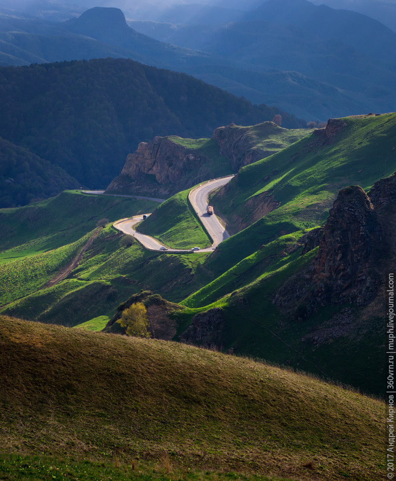 14. Вроде бы автобусам и грузовикам движение по перевалу запрещено, но на снимке ниже вы сможете разглядеть пыхтящий Камаз, груженный до верху досками, который преодолевает очередной виток серпантина.