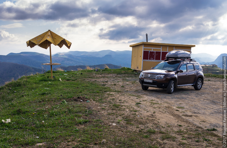 15. В ясную погоду с перевала Гум-Баши видно двуглавого великана Эльбруса, но нам пока доступна только небольшая гора Два Брата. Видите? А грунтовую дорогу, убегающую куда-то на плато Бечасын? Вот бы когда-нибудь проехаться и по ней!