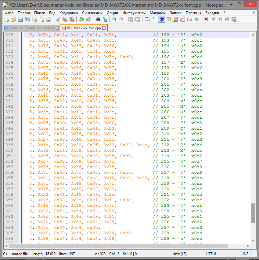 Далее, открываем файл по пути C:\Users\ХХХХ\Documents\Arduino\libraries\MD_MAX72XX-master\src