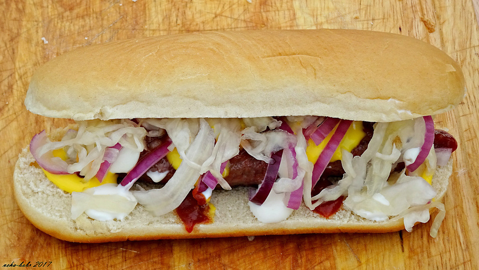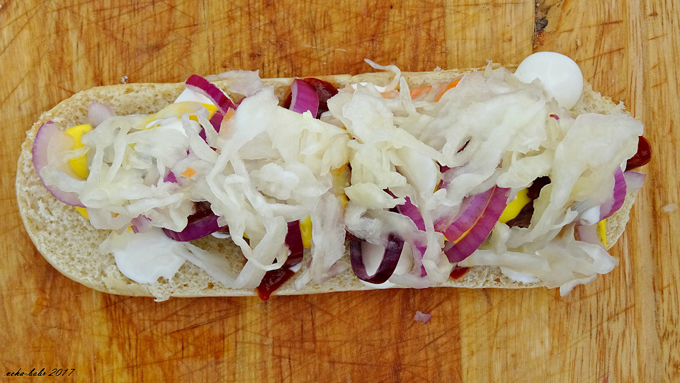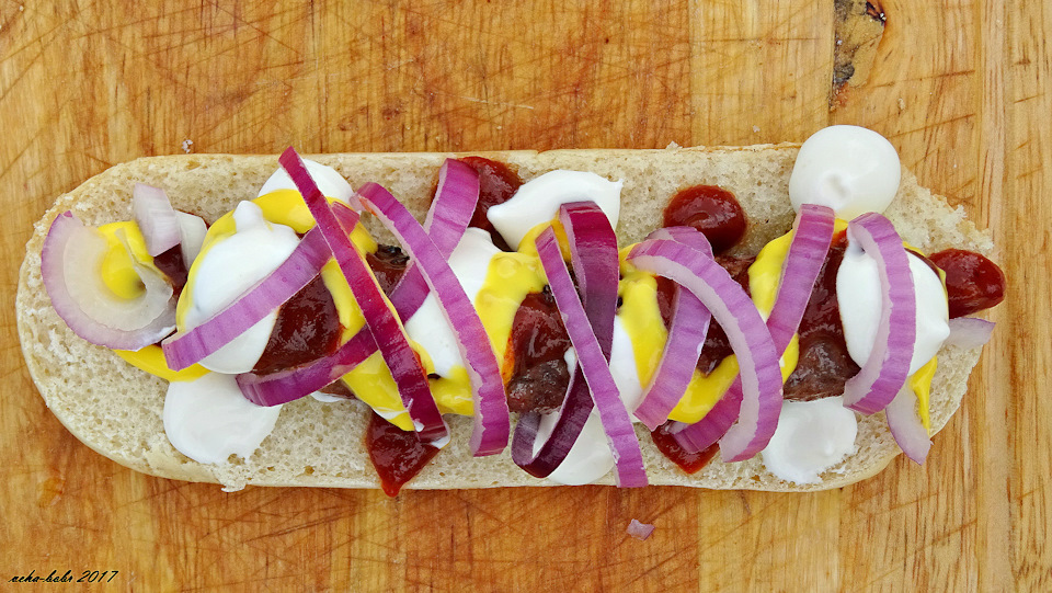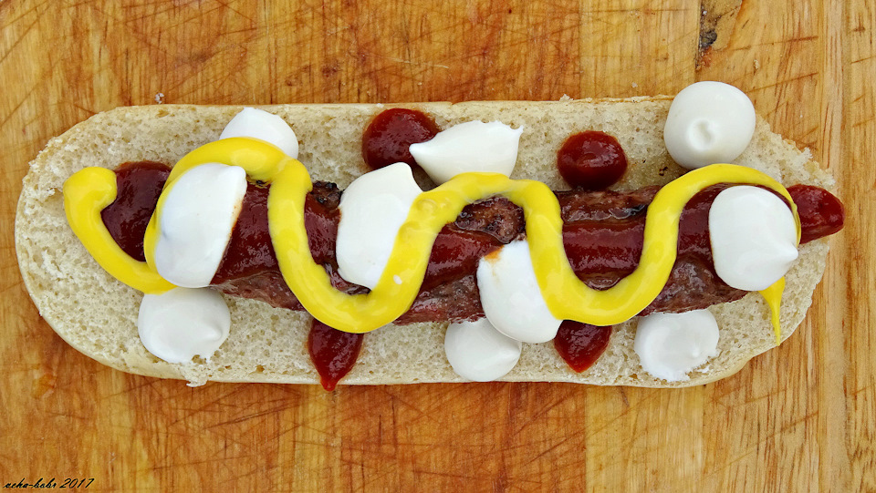 далее на колбаску добавляем соусы в произвольном порядке…