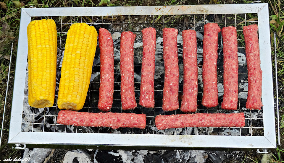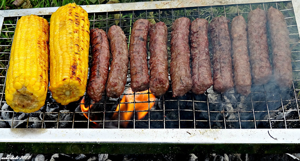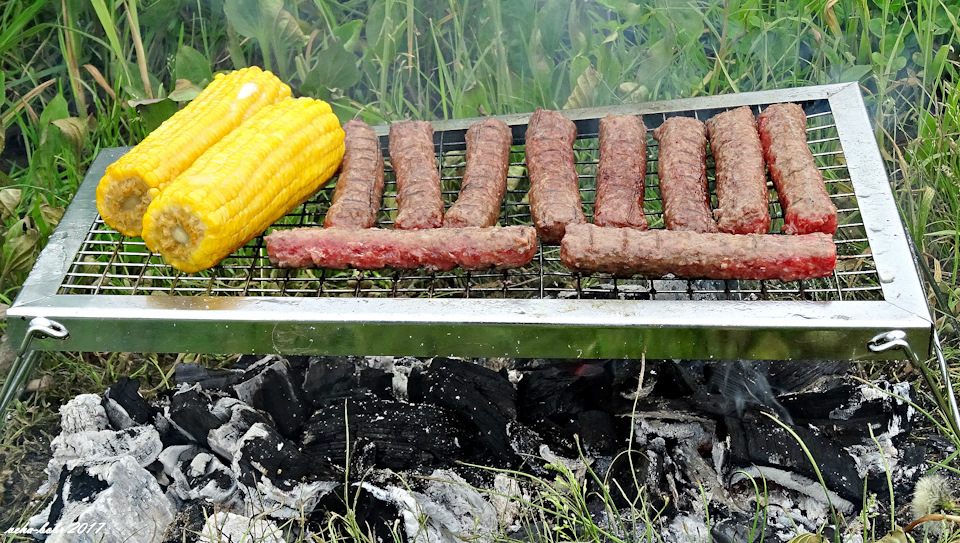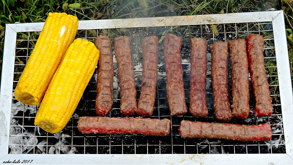 на месте старого костровища. прожигаю уголь и начинаю обжаривать чевапчичи и кукурузу…