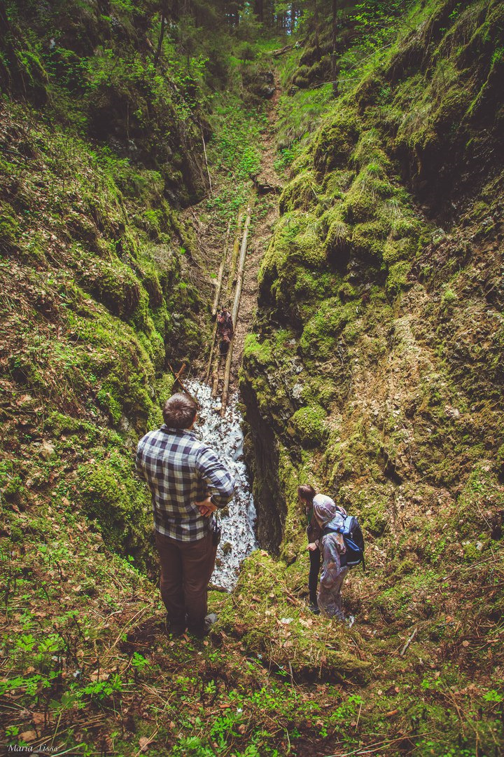 Когда-то здесь была большая пещера, но однажды свод ее обвалился и образовался такой вот провал. Склоны провала покрыты густой растительностью — в основном мхами и папоротниками. В центральной части воронки вертикально вниз уходит отверстие размером примерно 2 метра в диаметре. В нем всегда снег и лед. На дне провала — уникальный природный ледник. С одной стороны воронки достаточно легко в нее спуститься — склон там более пологий."