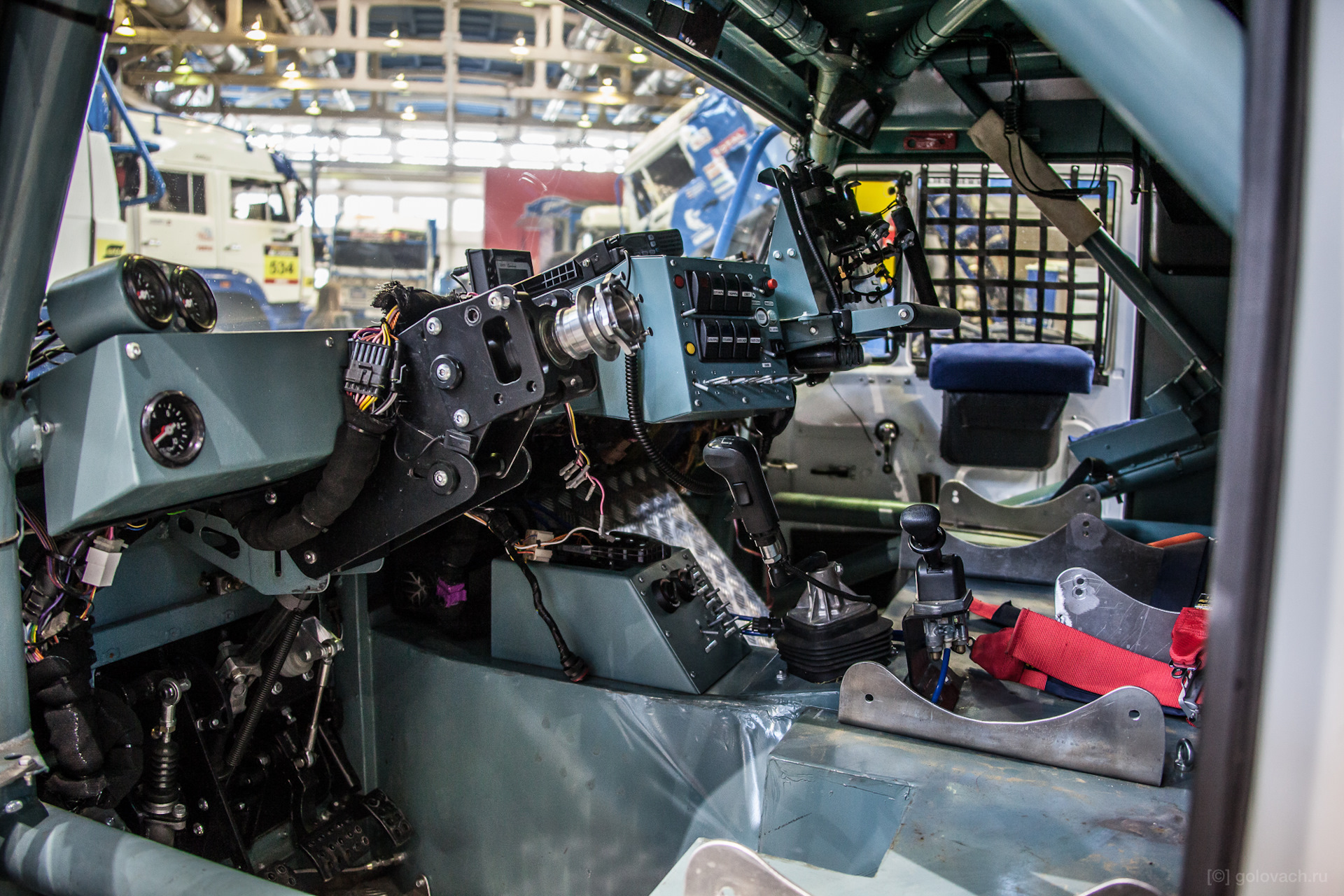 Без кузова анатомия гоночного грузовика – как на ладони. Виден 1000-литровый топливный бак, перед ним – ящик с инструментом и минимальным набором запчастей.