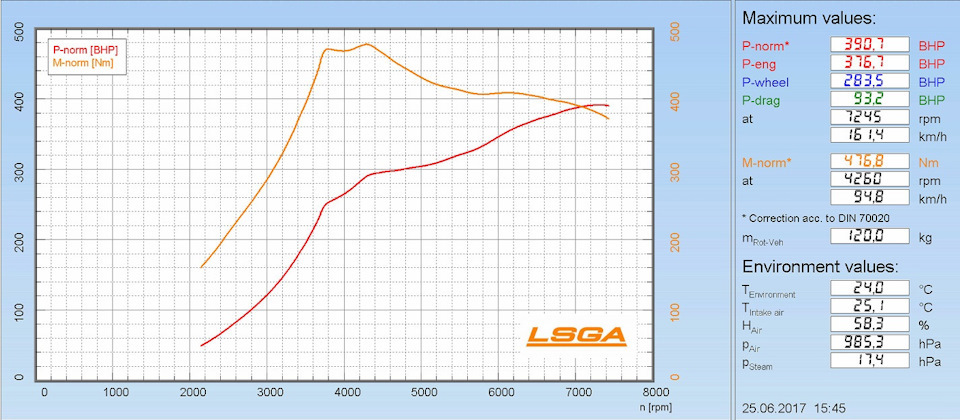 И так результат нескольких дней возьни…примерно 400 сил и примерно 500 момента с пиком в 4400 оборотов на всеми любимом стенде в LGSA.