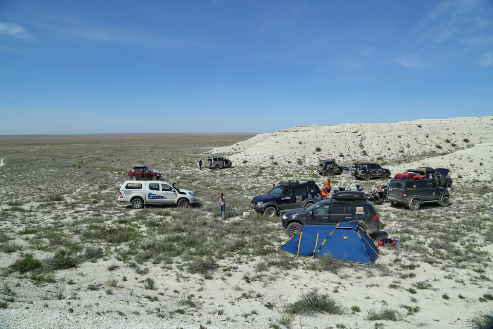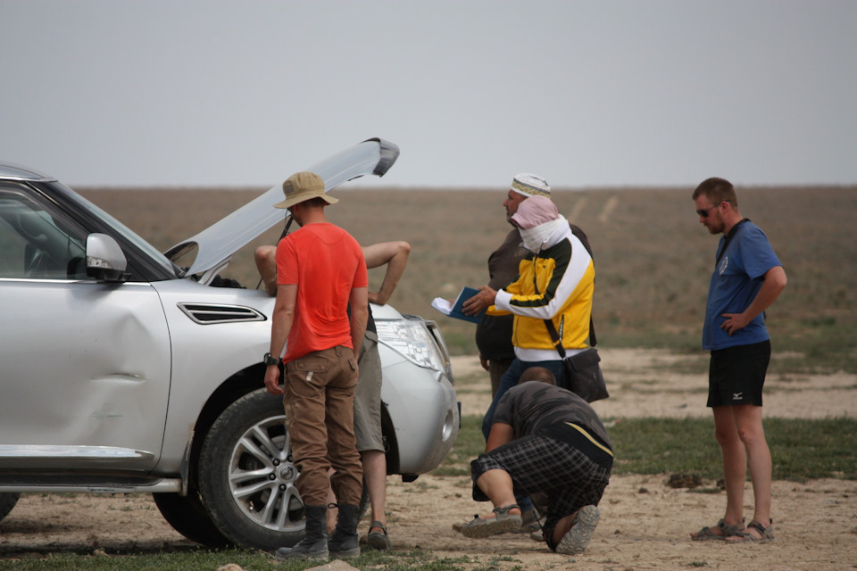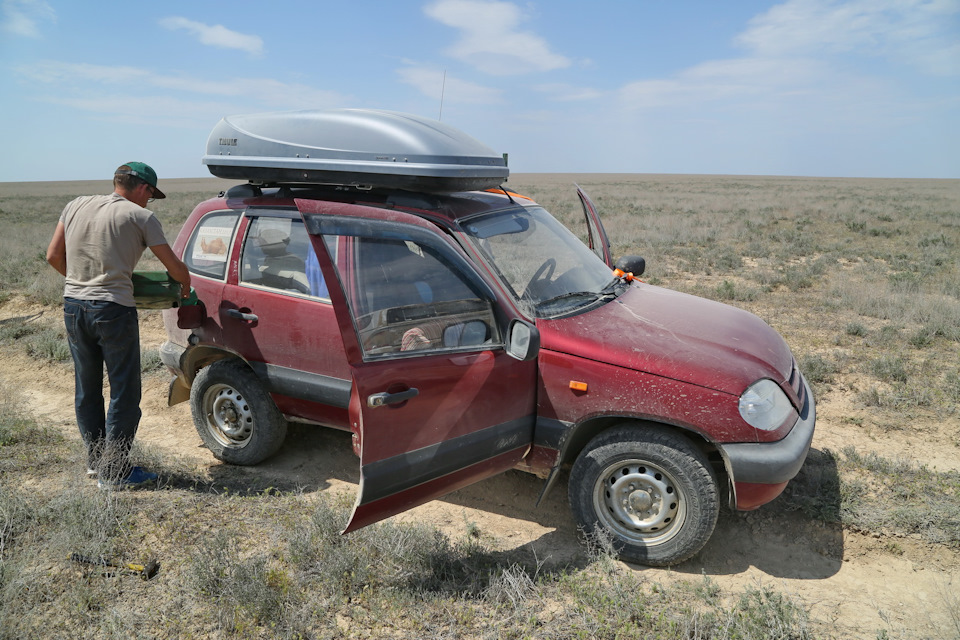 Важное дополнение: двигаясь по степи не разгоняйтесь слишком быстро и старайтесь выбирать дорогу с минимумом травы. Периодически останавливайтесь и осматривайте днище и нижнюю часть моторного отсека на предмет забившейся сухой травы. И обязательно во время пути держите под рукой исправный огнетушитель емкостью как минимум 3-4 кг. Будьте осторожны! Слишком много машин сгорело в казахских степях. Одну местную машину наша группа тушила. Так что, поверьте, это не пустое предостережение.