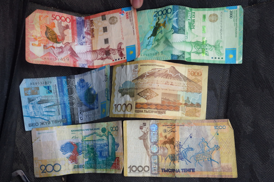 В Казахстане проходит замена валюты, на фото с теньге купюры номиналом 5000 и 2000 нового образца остальные старого, отличительная особенность бросается в глаза — столб с орлом и голубь на первом плане.