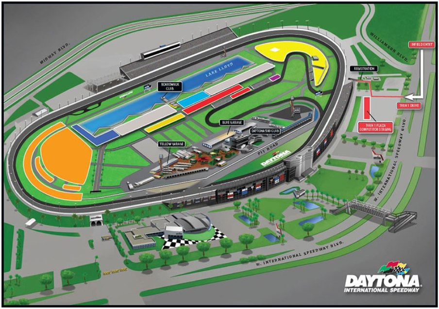 В отличие от Ле-Мана, гонка в Дайтоне проводится на полностью закрытой 3,56-мильной (5,728 км) комбинированной дорожной трассе Daytona International Speedway, в пределах овала, без использования городских улиц. Используется большая часть крутого бэнкинга*, который прерывается шиканой** на задней прямой и быстрой секцией инфилда***</i>, включающей две шпильки****</b>.