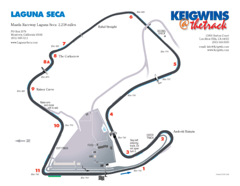 Это кольцевая, 11-поворотная гоночная трасса, длиной 1,9 мили (3,058 км), расположенная рядом с городом Монтерей в штате Калифорния, США. Используется для проведения авто- и мотогонок, принимает этапы многих международных и национальных американских чемпионатов. Имеет множество подъёмов и спусков с общим перепадом высот 91 метр. Особенность трассы — поворот "Corkscrew" ("Штопор"), который является одним из самых известных поворотов на гоночных трассах в мире, сравним по популярности с "Eau Rouge" в Бельгии и"Grand Hotel" в Монако. Отличается крайней сложностью, поскольку самого поворота в момент торможения не видно. Что поворот из себя представляет: разгонная прямая в гору перед поворотом резко уходит налево и вниз, после чего практически сразу идёт правый поворот.