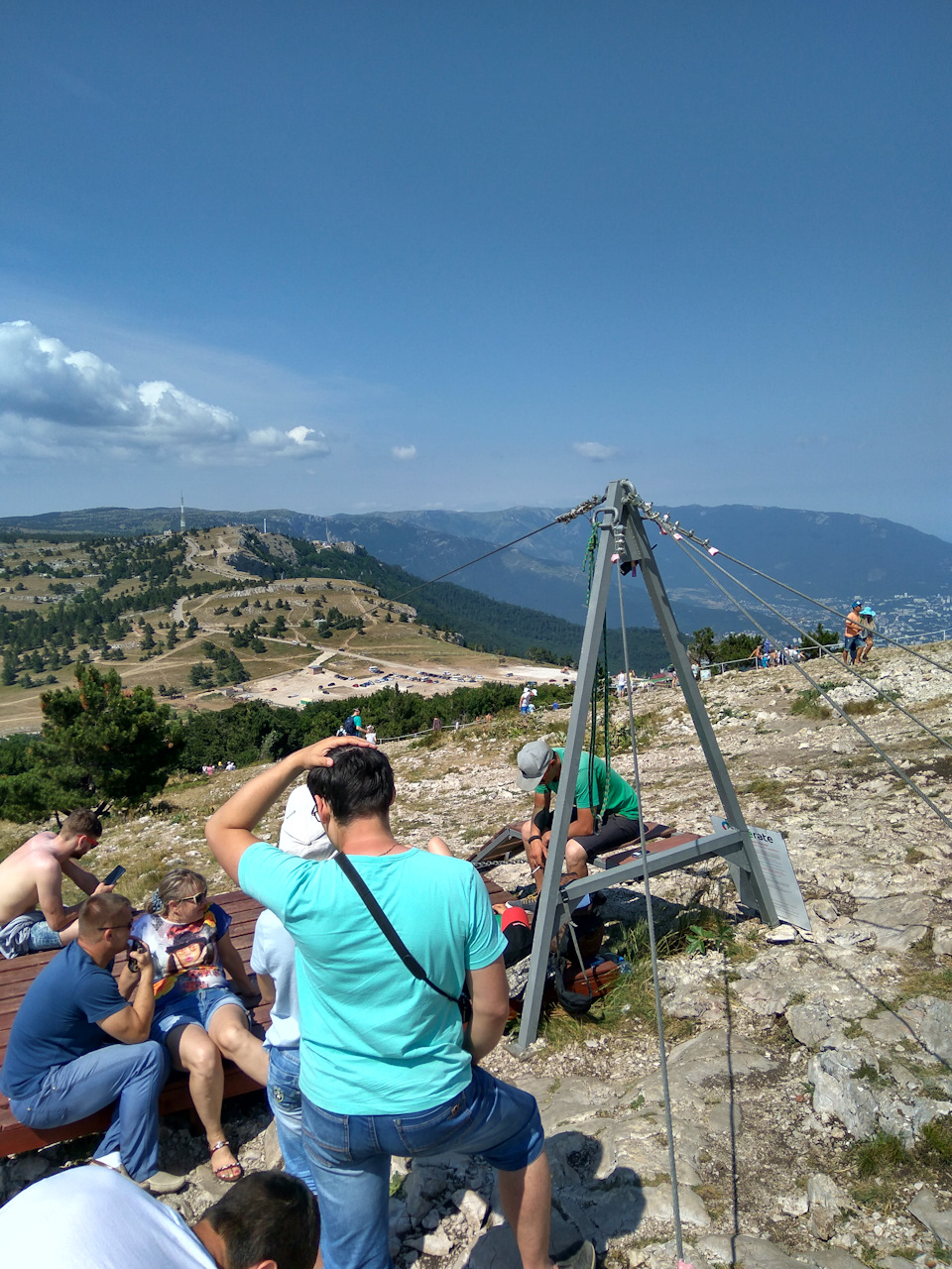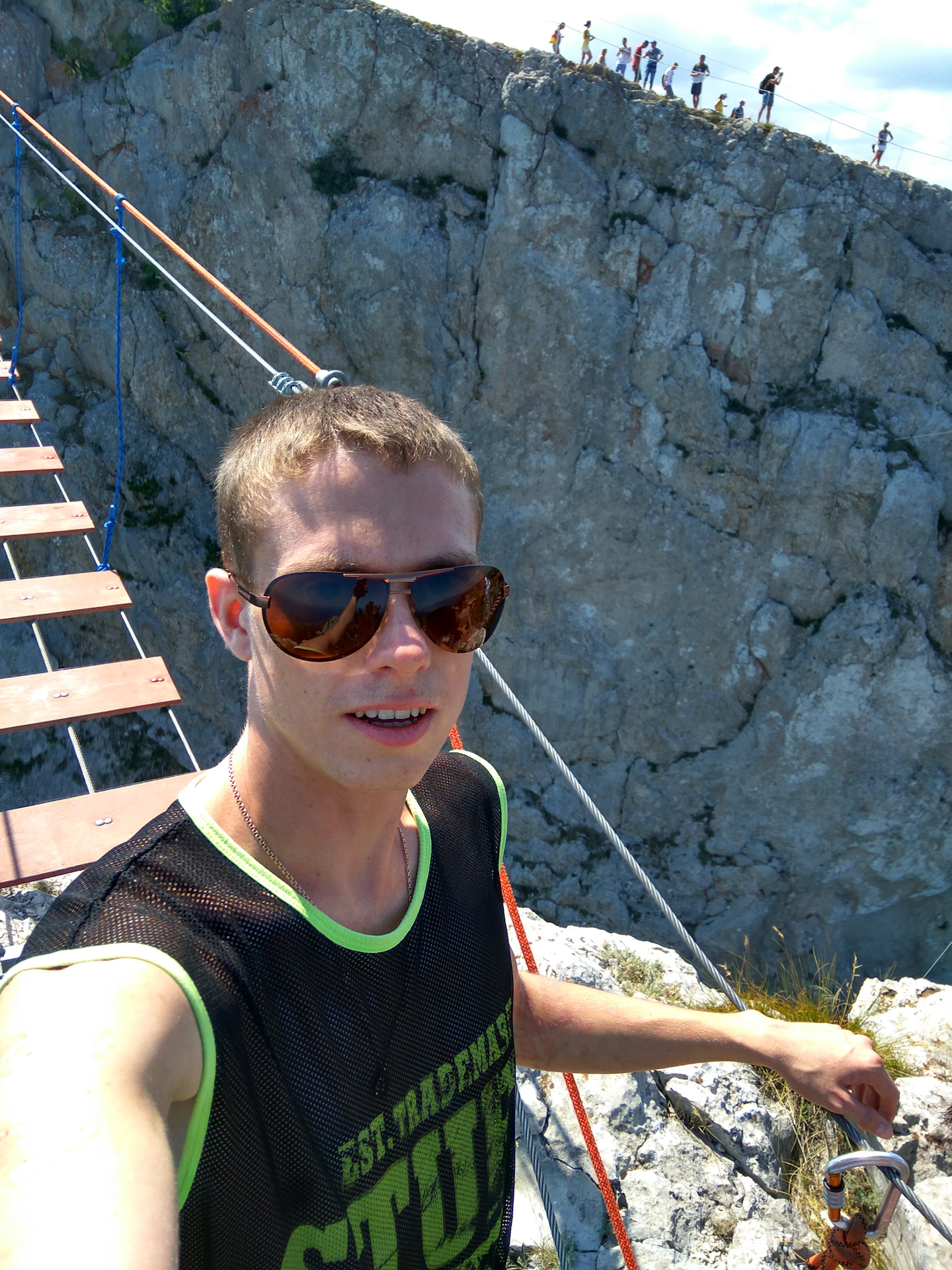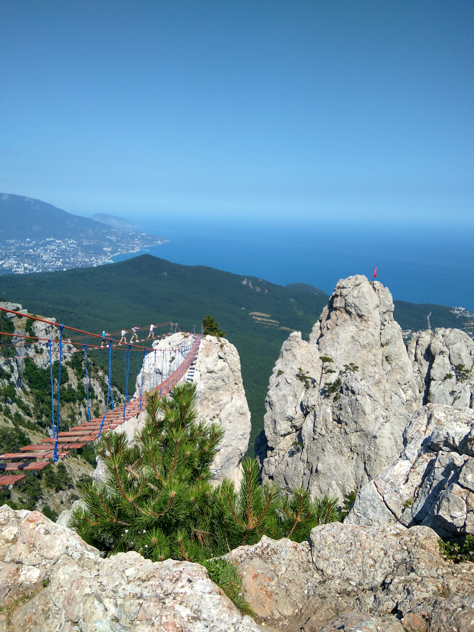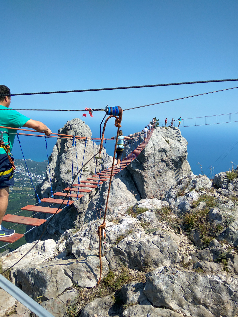 Разделенный на два пролета зубцом тросовый мост находиться на 60 метрах над скалами и 1200 над уровнем моря)Вид как и во многих местах Крыма — непередаваемый.