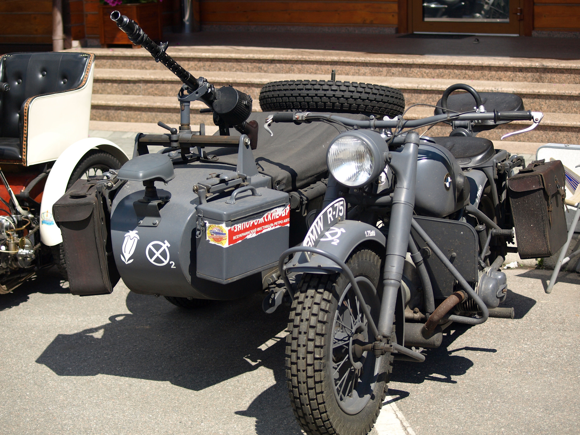 Массовый тяжелый немецкий мотоцикл BMW R 75 появился в 1940 году. Благодаря двум задним ведущим колесам (привод передавался и на коляску), мотоцикл мог буксировать легкое артиллерийское орудие, или небольшие прицепы с хозтоварами. Передняя телескопическая вилка, дифференциал в приводе колеса коляски, гидравлический привод тормозов – эти новшества появились на BMW в мировой массовой мотоиндустрии впервые. Но множество ноу-хау сыграло с компанией и немецкой армией злую шутку – мотоцикл оказался слишком дорогим (по цене был почти сопоставим с простым внедорожником типа "Виллиса", но умел меньше), в связи с этим и тираж ограничился 16 000 штук.