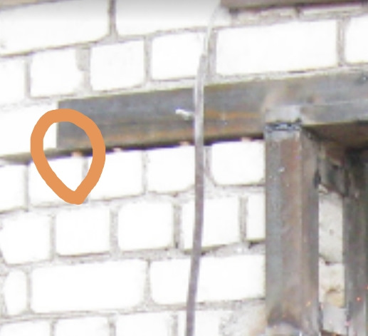 Шаг 7 — Провариваем все соединения старых и новых уголков, также отрезками полосы свариваем между собой внутренний и наружный уголки. Также в щели между горизонтальным уголком и верхним рядом кирпичей забиваем деревянные распорки, это равномерно распределит нагрузку по всей длине уголка.
