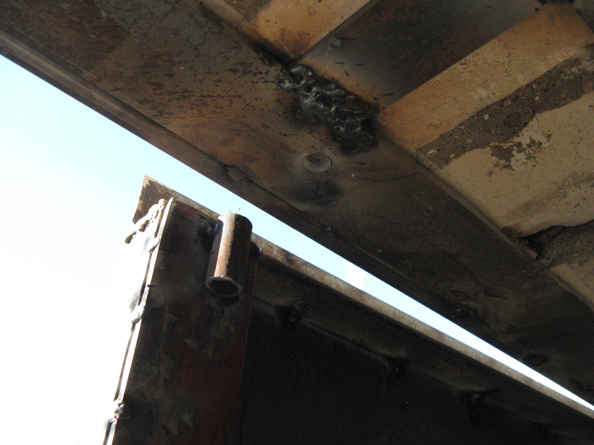 По шпингалетам я брал 16 трубу и 14мм арматуру или что-то похожее по диаметрам, чтобы одно в другое входило с небольшим зазором, далее уже варил к каркасу. В перекладине над воротами сверлил отверстие под арматуру, см. фото