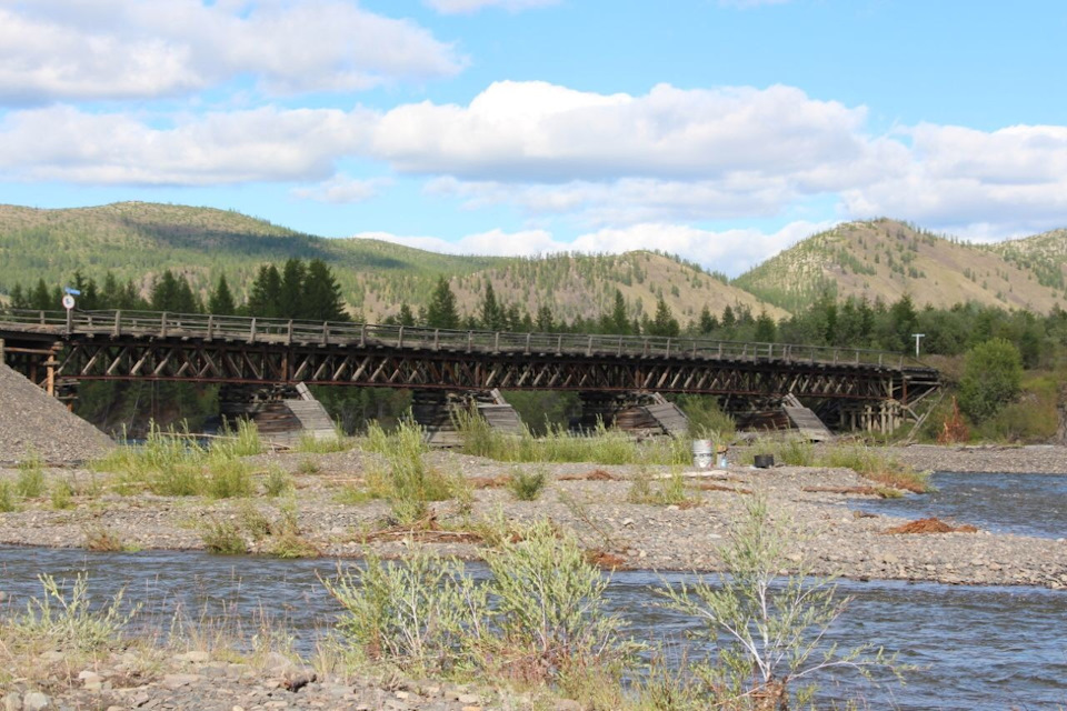 После Томтора утыкаемся в мост. Мост в дырах, прям на дыры накиданы доски. Особо творческим натурам можно поиграть в лего, перекидывая доски с места на место, или попрыгать на них, проверяя на прочность. Но прошедшая за несколько минут до этого буханка не оставляла сомнений: по мосту ездят. Страхов и сомнений, как в отчете казахов, местные при этом не испытывают. И трагизма нет, и штурмана вперёд не посылают.
