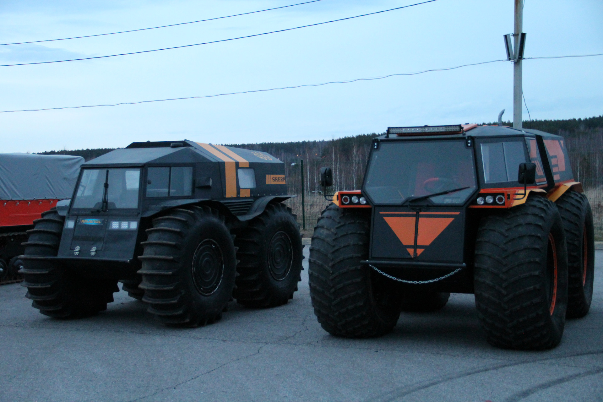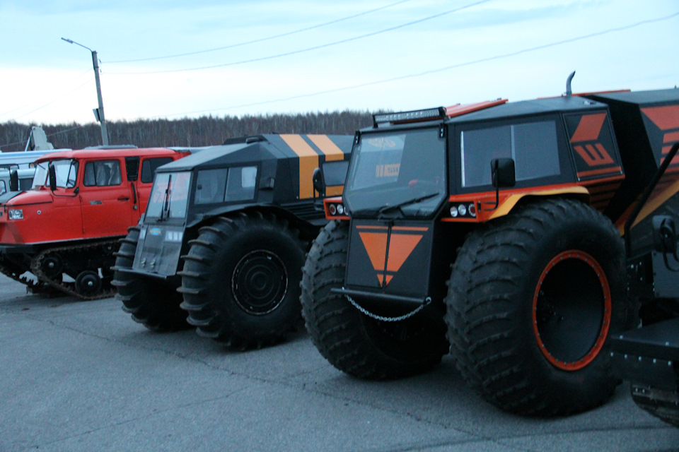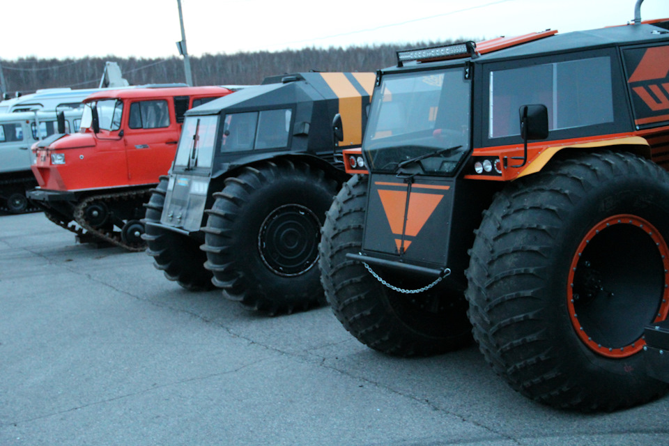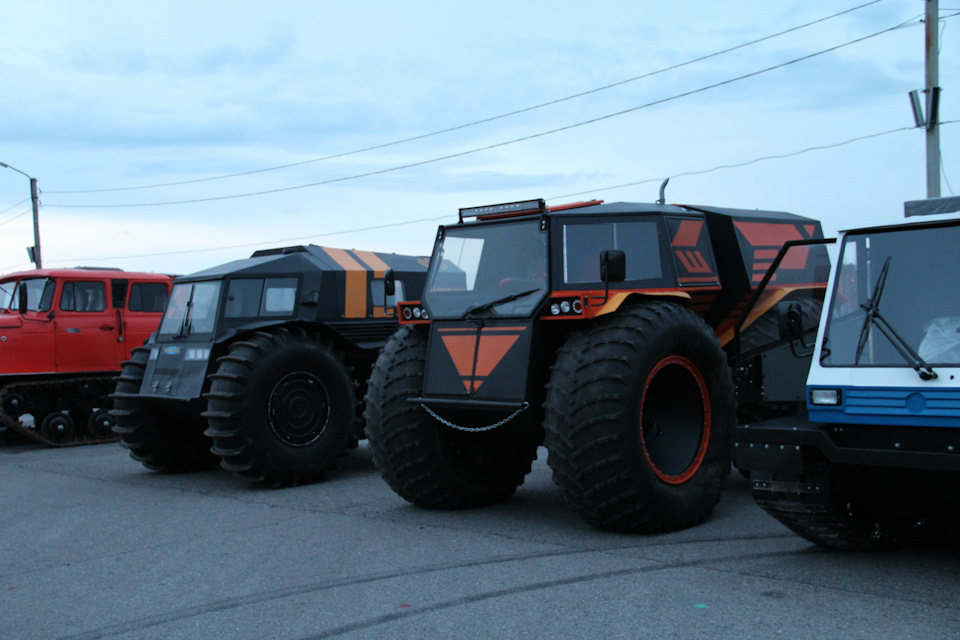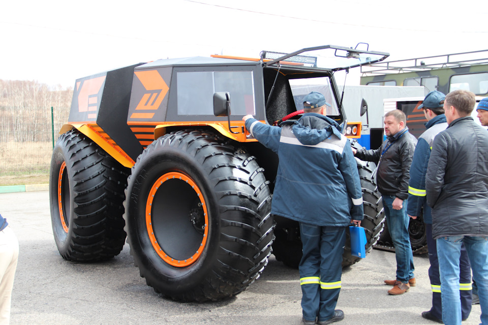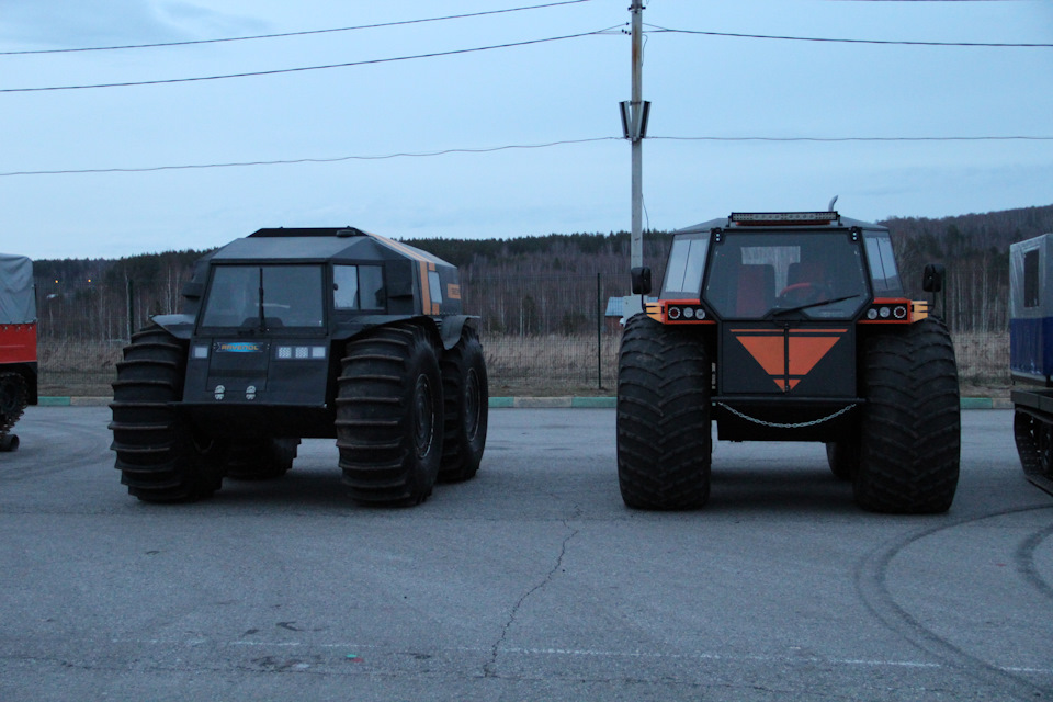 Если Вы посмотрите на фото вездехода Шатуна, где он стоит рядом с Шерпом. То заметите, что и колеса у него крупнее. Здесь высота колеса составляет 1.75м, тогда как у Шерпа диаметр Шины равен 1.60. Огромное колесо вмещает в себя 1 200л воздуха, а как мы знаем — большие колеса почти всегда помогают на бездорожье.