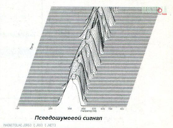 Постоянство амплитуды псевдошумового сигнала наиболее наглядно демонстрируют трёхмерные картинки, где показано изменение амплитуды и частоты со временем. «Горный кряж» фильтрованного розового шума имеет хаотически меняющуюся высоту, а узкий, тоже довольно причудливо извивающийся хребет псевдошума высоту над уровнем моря имеет постоянную. Что нам и нужно.