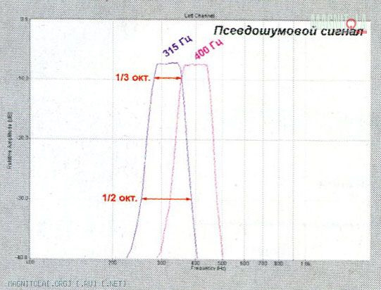 Фильтрованный розовый шум записан, например, на настроечном диске IASCA «Setup & Test». Он получен из широкополосного с помощью фильтров с очень высокой крутизной характеристики, 48 дБ/окт. Вместе такие полосы (их 31) перекрывают диапазон от 20 Гц до 20 кГц, и то и другое включительно. Однако позже придумали усовершенствование в этой технологии измерений, основанной на применении псевдошумового сигнала вместо фильтрованного шумового. Чем плох фильтрованный розовый шум? Во-первых, даже при использовании фильтров с очень высокой крутизной, каждая полоса захватывает диапазон частот шире, чем треть октавы. На уровне -20 дБ, например, сигнал с «Setup & Test» имеет ширину полосы уже втрое больше, чем на номинальном уровне. Но это ещё полбеды. Шум — сигнал хаотический. Пока значение амплитуды усреднится, должно пройти некоторое время. При работе с RTA это не проблема, он — многостаночник и лишние несколько секунд погоды не делают. Когда же приходится мерить «ручками», полосу за полосой, желательно иметь более предсказуемый в смысле амплитуды сигнал. Он есть, и называется псевдошумовым. Делается он из синусоидального, частота которого случайным образом меняется в строго заданном диапазоне, например, для полосы с центральной частотой 315 Гц это будет от 280 до 250, и ни на герц туда или сюда. То, что частота меняется случайно, делает такой сигнал близким к шумовому, а поскольку сырьё — тональный сигнал, случайных колебаний амплитуды не возникает. АЧХ двух соседних полос псевдошумового сигнала с нашего диска можно увидеть на графике и оценить то обстоятельство, что на уровне -20 дБ по отношению к номинальному ширина полосы возрастает крайне незначительно.