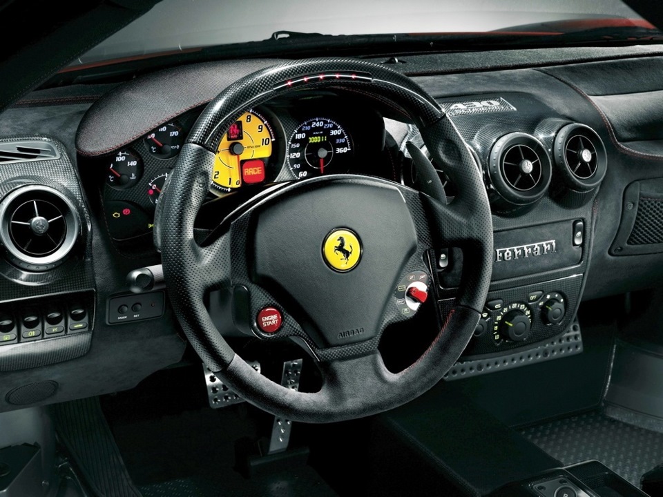 Едешь на Италии — сразу думаешь "Вау, какая быстрая!". Очень быстро разгоняется, отлично тормозит, шикарно рулится. Единственное что — система стабилизации уж очень навязчиво отсекает все попытки сорвать заднюю ось, причем делает это "наперед", но это лечится с помощью маленького рычажка на руле. Что самое удивительное — ощущений за рулем Италии не намного меньше (Хотя конечно меньше. Но не намного :) ) чем в гипер-каре Авентадоре (на котором я в прошлом году колесил). И машина более "продумана", что-ли. Даже управление поворотниками, которое некуда ставить в суперкарах (подрулевые лепестки мешаются), от которого я так плевался в авентадоре (там физически невозможно включить их, не снимая руки с руля — они очень далеко), в феррари расположено прямо на руле, под большими пальцами: