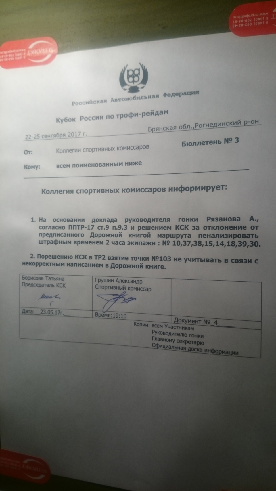 Как мне удалось выяснить из беседы с организаторами — под вышеописанным они подразумевали движение по обочине вдоль асфальта. Но после вопроса — покажите как проехать по обочине через мост над рекой, больше я этой версии не слышал…В общем под тяжестью доказательств и давлением общественности на табло появился Бюллетень №3: