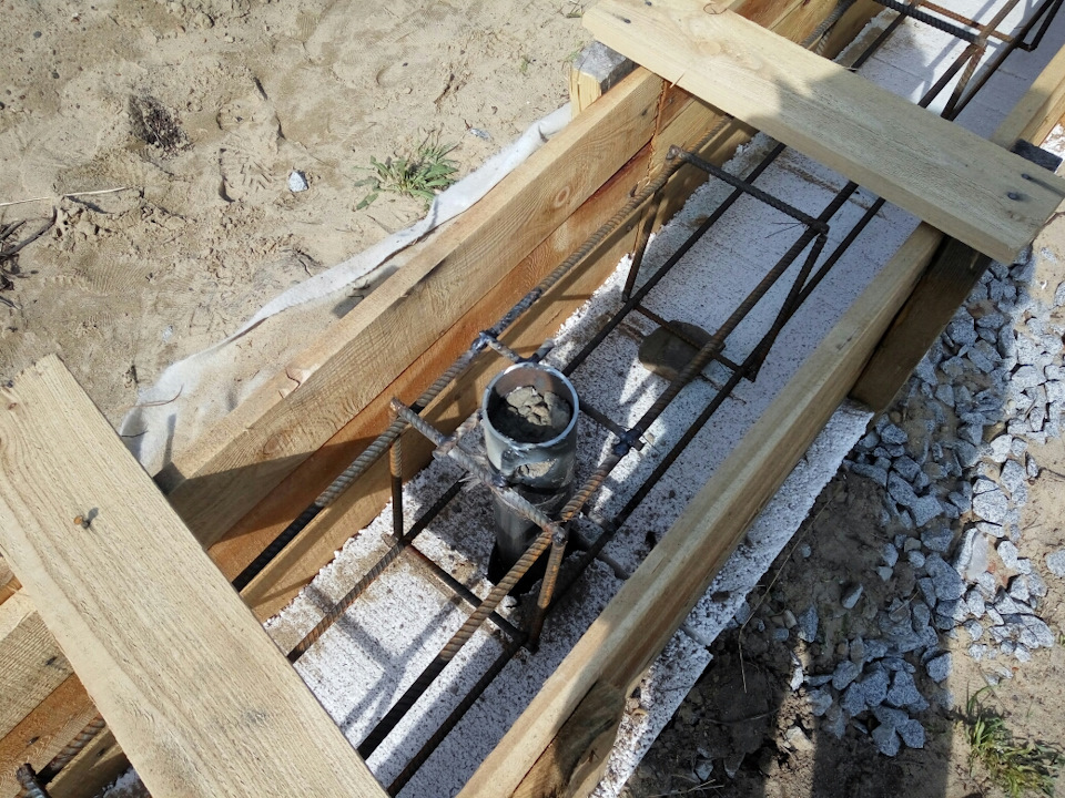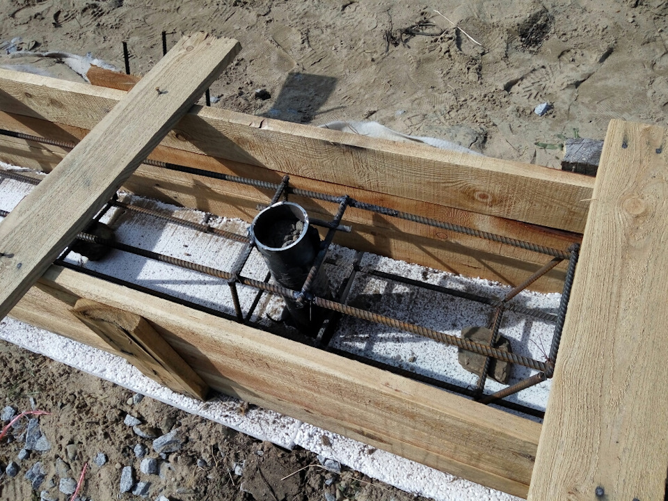 Уложен геотекстиль, затем засыпана подушка из щебня (фракция 20-40). Пенопласт 15 плотности 10 см. Выставлена опалубка. Размер 36 на 38 см.