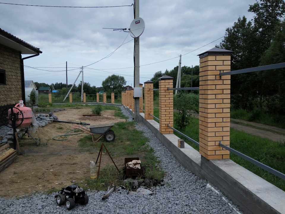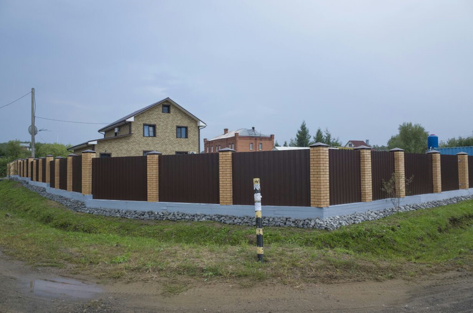 Профнастил С-13 высота листа 1.75 метра. Кирпичные столбы закрыты декоративными колпаками.