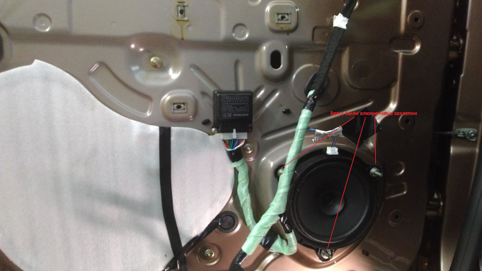 Для протяжки провода управления, динамик пришлось отсверлить от алюминиевых заклепок, так как руку просунуть больше негде.