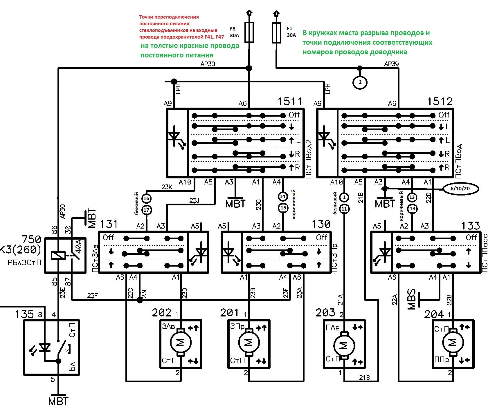 Это кому как понравиться, я переподключил стеклоподъемники с (питания при зажигании) на постоянное. На схеме показано куда подключался, фото монтажного блока сделать не получилось, к его обратной стороне добраться проблематично, не то что бы еще и сфоткать.