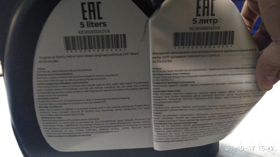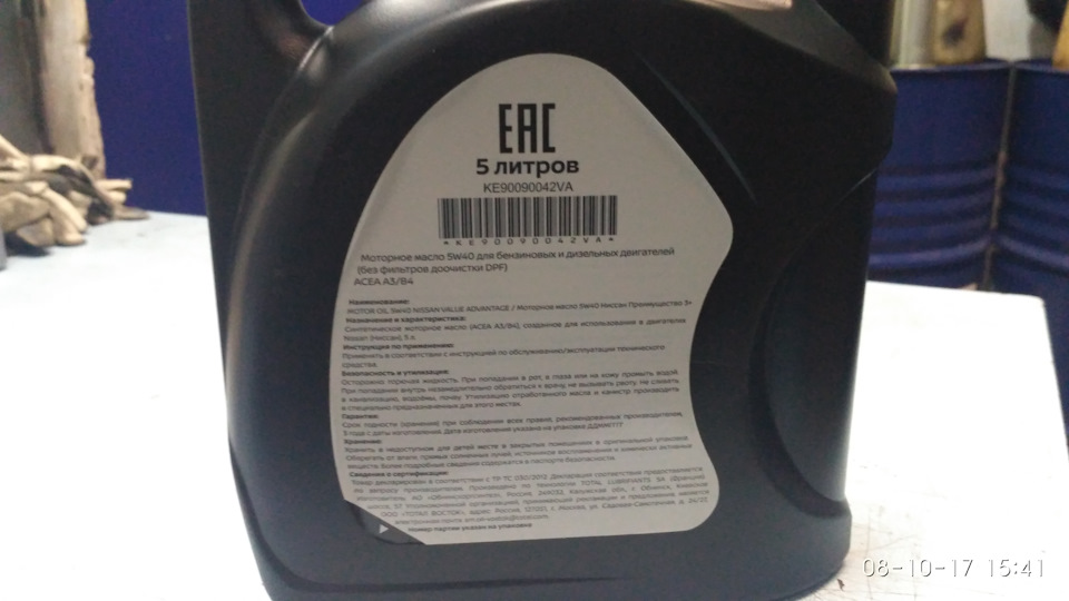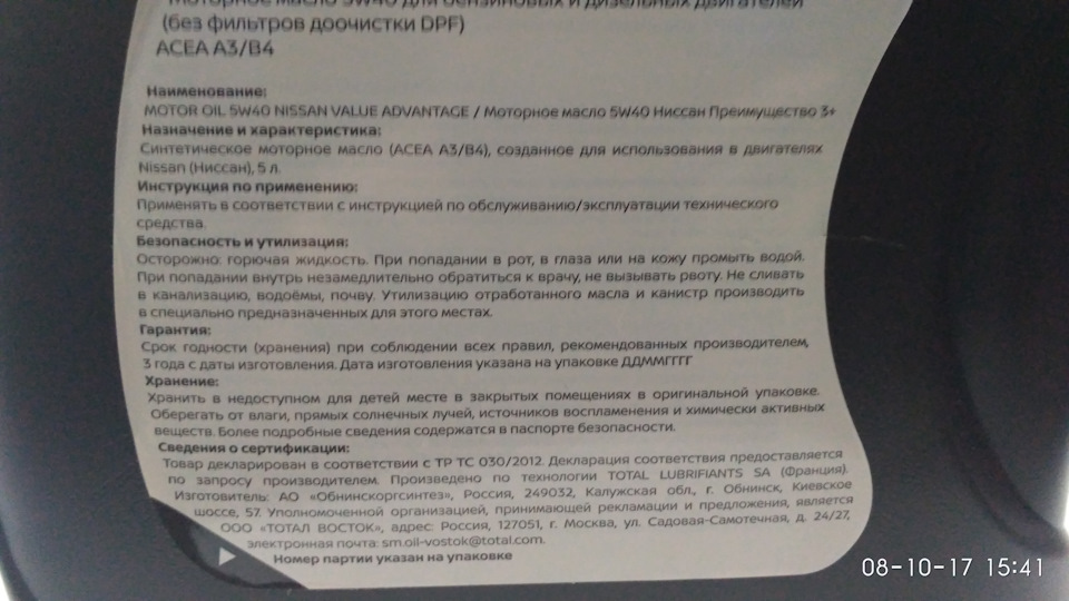 Из этикетки мы в который раз узнаём что корпорация Total/Elf тесно связана с маркой Nissan, но есть одно НО, в этот раз производство данного масла не в Бельгии как пишется на родных серых (белых) канистрах, а производится в Калужской области, г. Обнинск. АО "Обнинскоргсинтез", и соответственно это АО производит масла и антифризы Sintec… ничего конечно не знаю про качество данной продукции, но думается мне что в этой "оригинальной" канистре будет тот же самый SINTEC PLATINUM SAE 5W-40 API SN/CF. Возможно, конечно рецептура была немного изменена под условия Nissan, но думаю был тупо розлив из того что было =)