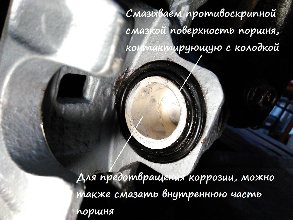И я правильно понимаю, при замене колодок выдавить поршень на максимум, отогнуть пыльник при помощи шприца затолкать смазку и распределить по всей площади, ну и туда сюда погонять поршень и все сборка)верно?