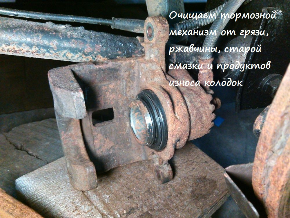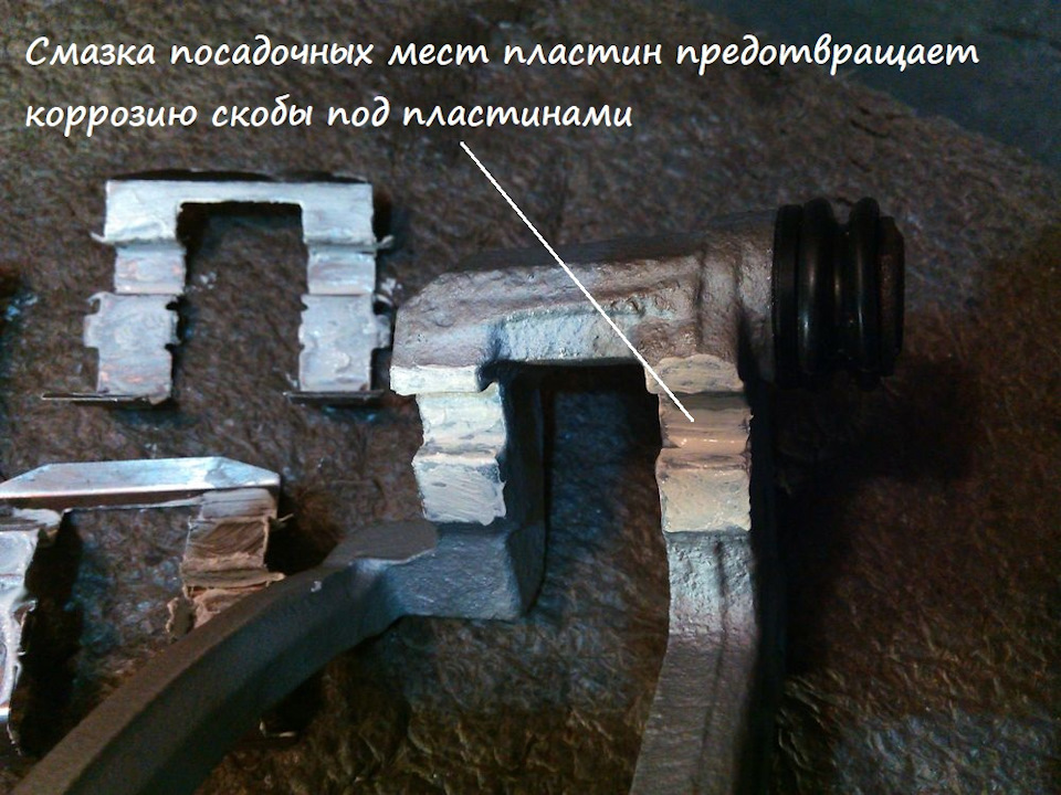 слишком много смазки, а по сути в данной конструкции смазка нудна только в направляющих — сама пластинка из полированной нержавейки между колодкой и скобой и является тем решением, которое избавляет от необходимости использовать смазку!