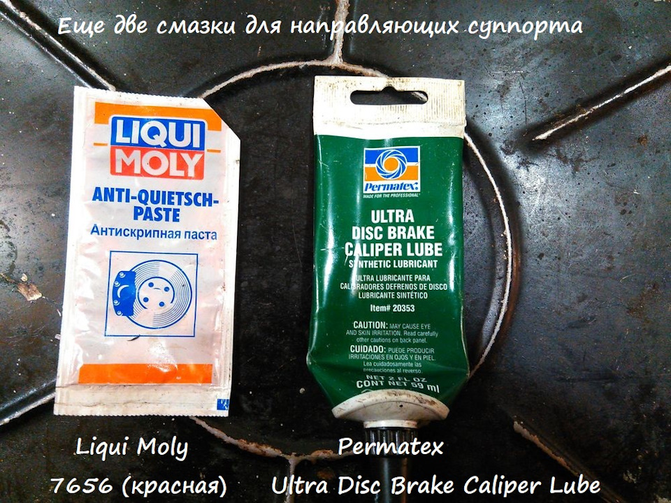 1) Смазки для направляющих суппорта. Предназначены для смазывания направляющих, работающих в колодцах скоб суппорта. Для этого подходят только специализированные смазки. Я применяю смазки TRW PFG110, Permatex Ultra Disc Brake Caliper Lube, Liqui Moly арт. 7656.