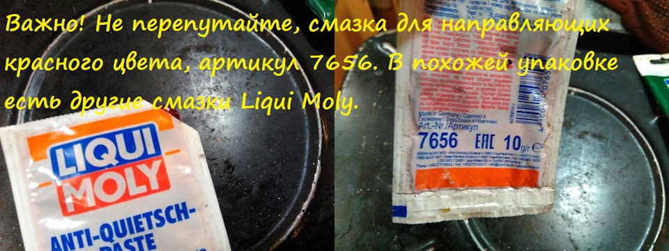 2) Противоскрипные смазки (пасты). Предназначены для смазывания направляющих тормозных колодок, устранения высокочастотных скрипов в местах контакта колодок и деталей суппорта, а также для предотвращения коррозии. Для этой цели я применяю смазки ВМПАвто МС1600, Liqui Moly Kupfer-Paste, Liqui Moly арт. 7585. Данные смазки для смазывания направляющих суппорта НЕ подходят!