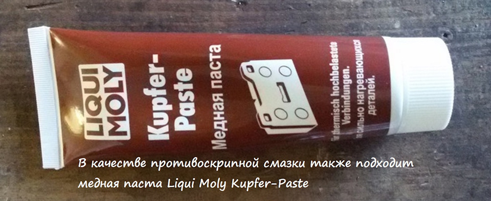 3) Смазки от прикипания деталей. Применяются для смазывания крепежа, облегчают последующую разборку. Я знаю, что есть убежденные противники смазывания какого бы то ни было крепежа, поэтому никого переубеждать не буду. Я применяю высокотемпературные смазки от прикипания, такие как ВМПАвто Медная смазка, Liqui Moly Kupfer-Paste (медная), Permatex Nickel Anti-Seize (никелевая) и др. Во многих случаях могут использоваться и как противоскрипные смазки для п.2. Данные смазки для смазывания направляющих суппорта НЕ подходят!
