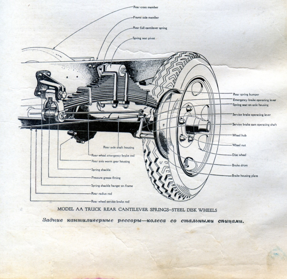 Подвеска принципиально изменилась только сзади – там появились консольные рессоры (только для грузовой модели «АА»), при сохранении толкающей штанги. Спереди осталась поперечная рессора. Тормоза механические на все колеса. Но зато появились роторные гидравлические амортизаторы. Правда только для модели "А", включая пикапы и фургоны.