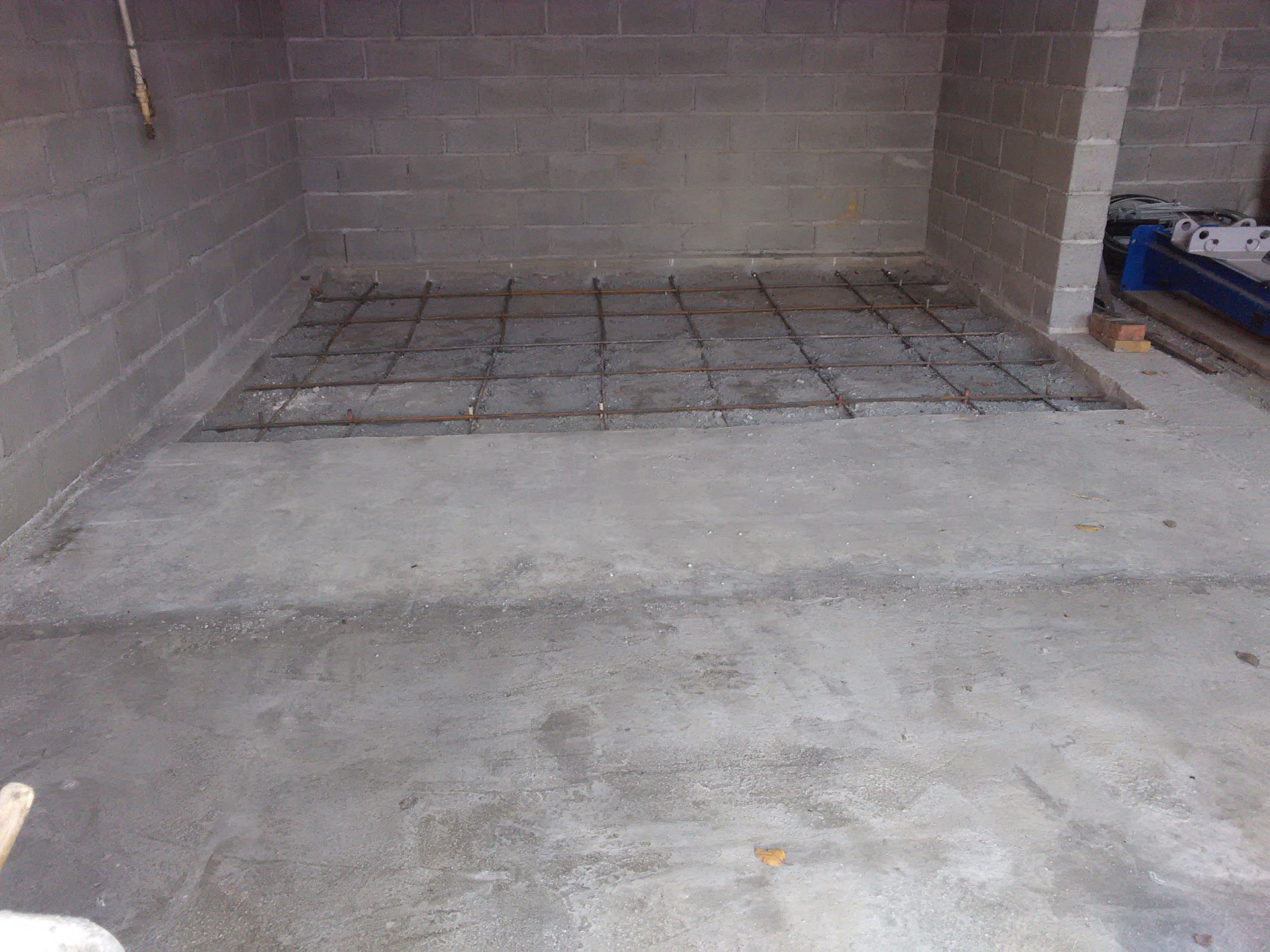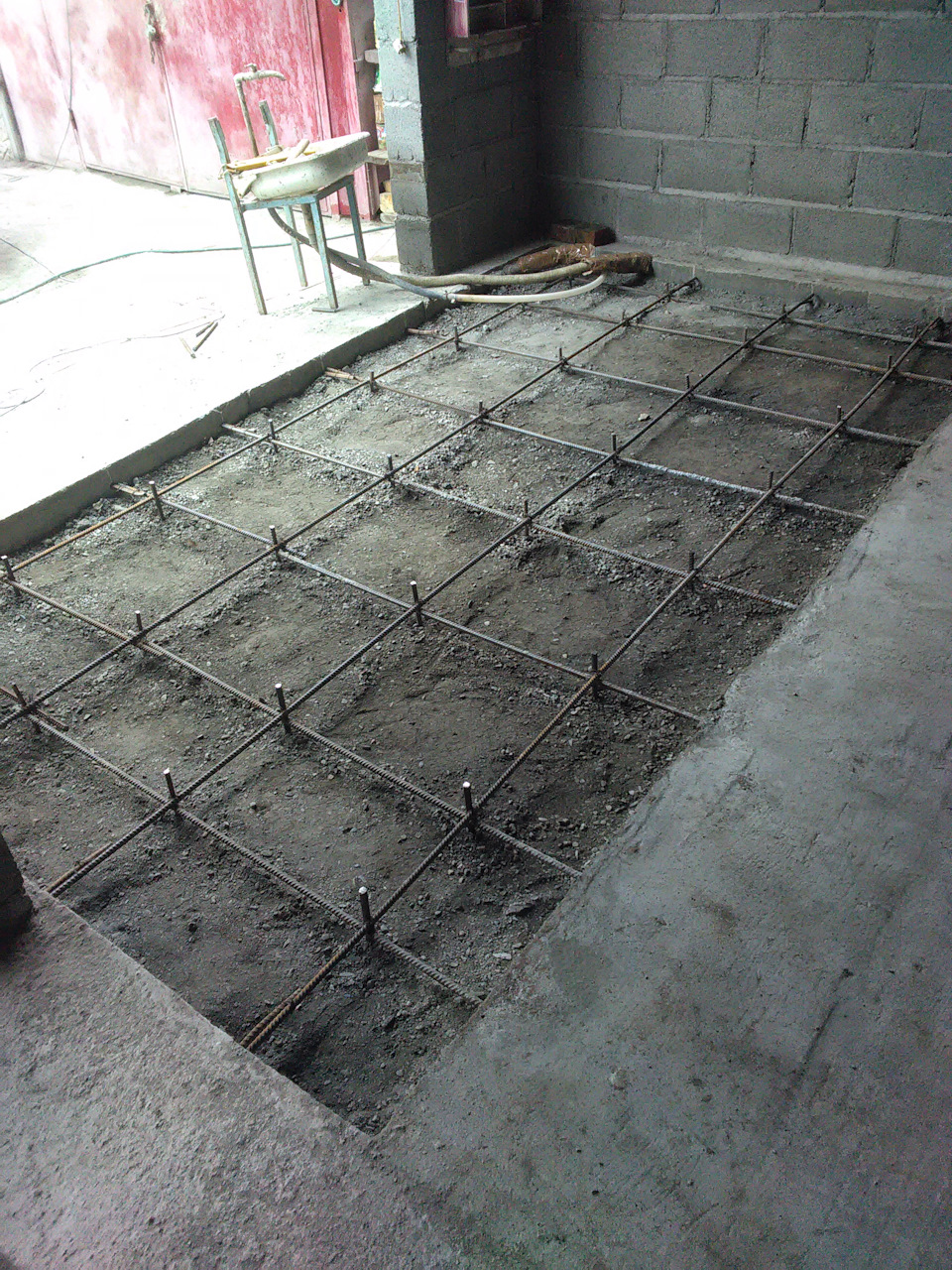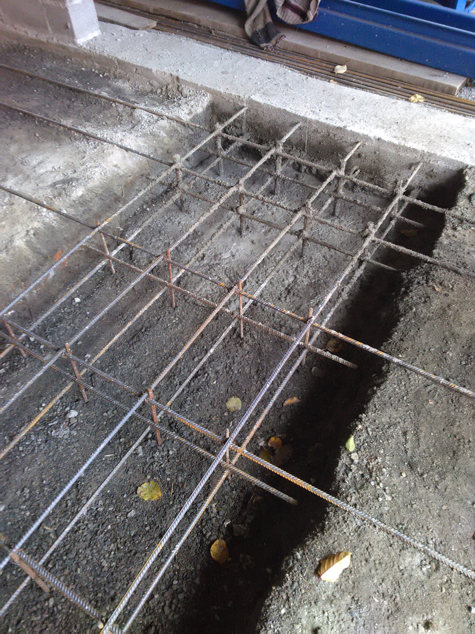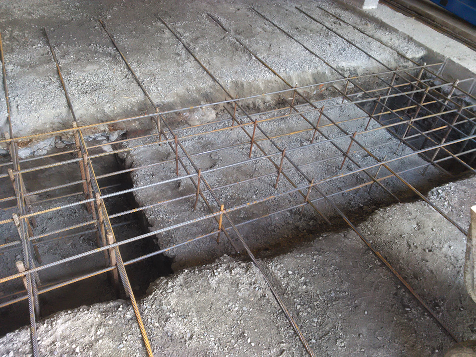 Получился пол с колономи заглублением 120см. но правая стойка подъёмника подъёмника ставилась по въезду с ворот на частично правую ленту фундамента но думаю тк всё так армировано и залито то не будет проблемы, левая стойка полностью попадала на колону.