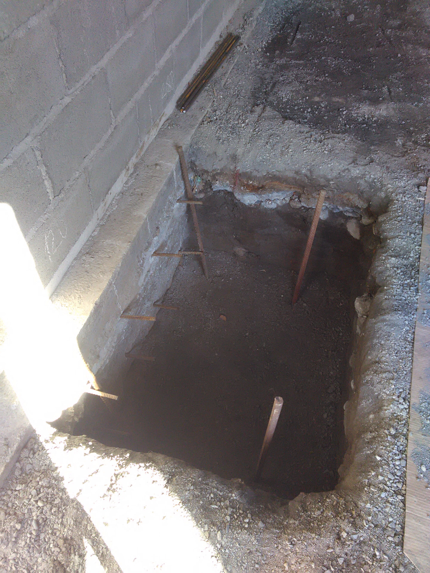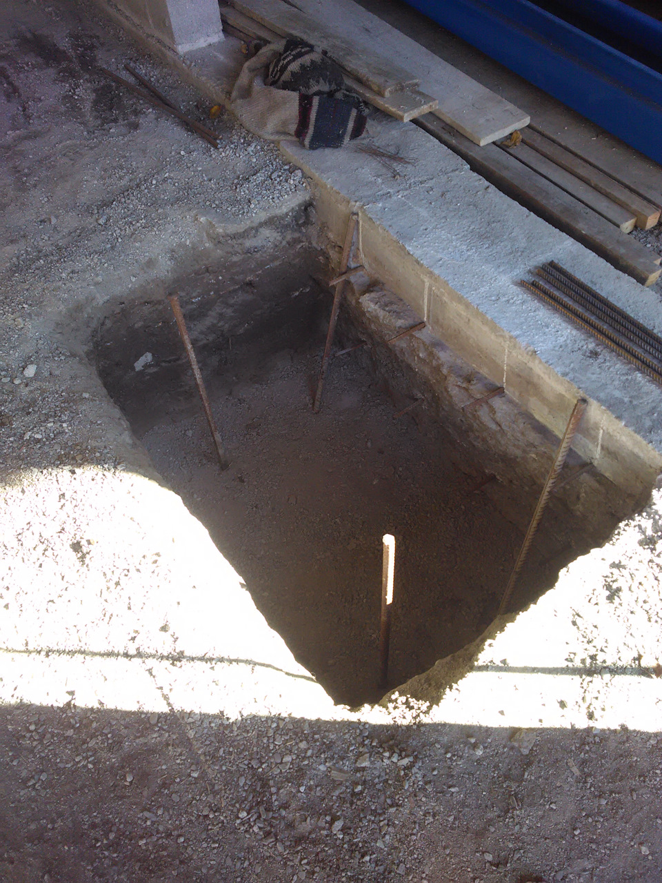 Далее копал спереди и сзади от центра от колон примерно 15см, в фундамент также колышки по 20 см (бетонозацепы) к ним уже 12 арматуру и за то что в центре всё обвязывал проволокой для скручивания арматуры и заливал.