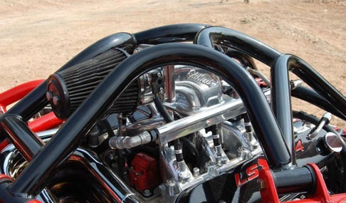 Всего несколько лет потребовалось Камерону, чтобы создать этого дьявола. Багги состоит из 60 метров толстых стальных труб, двигателя LSX 454 от General Motors (~700 л.с.), сопряженного с автоматической трансмиссией Powerglide, пара сделанных на заказ осей, 16-дюймовых пружинно-гидравлических амортизаторов и набором 43-дюймовых шин.