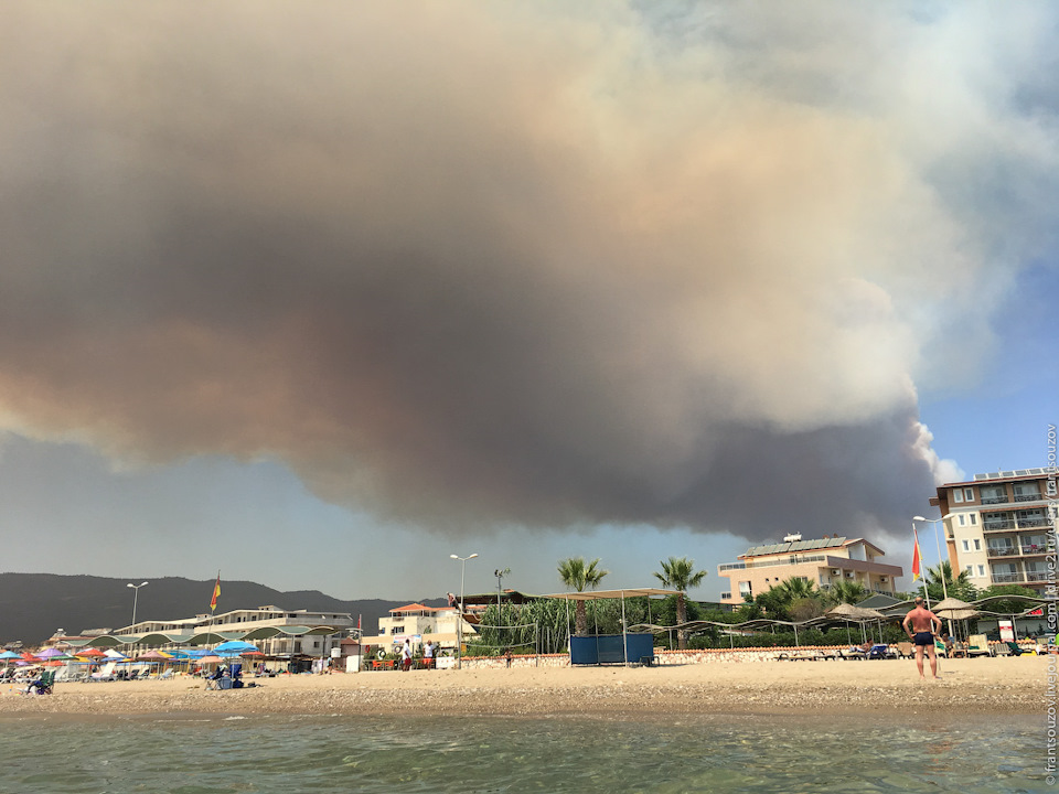 12. Правда, даже на этот раз без приключений не обошлось. На улице стояла жара под 40 градусов, в горах вспыхнул пожар. Издалека выглядело словно извержение вулкана, а с неба на воду падали хлопья пепла. В городе отрубилось электричество, в отеле постоянно отключалось централизованное кондиционирование, и в номере было тяжеловато находиться. Спасались холодным пивом, а по утрам прилетали вертолёты, набирали морской воды и улетали обратно в горы…
