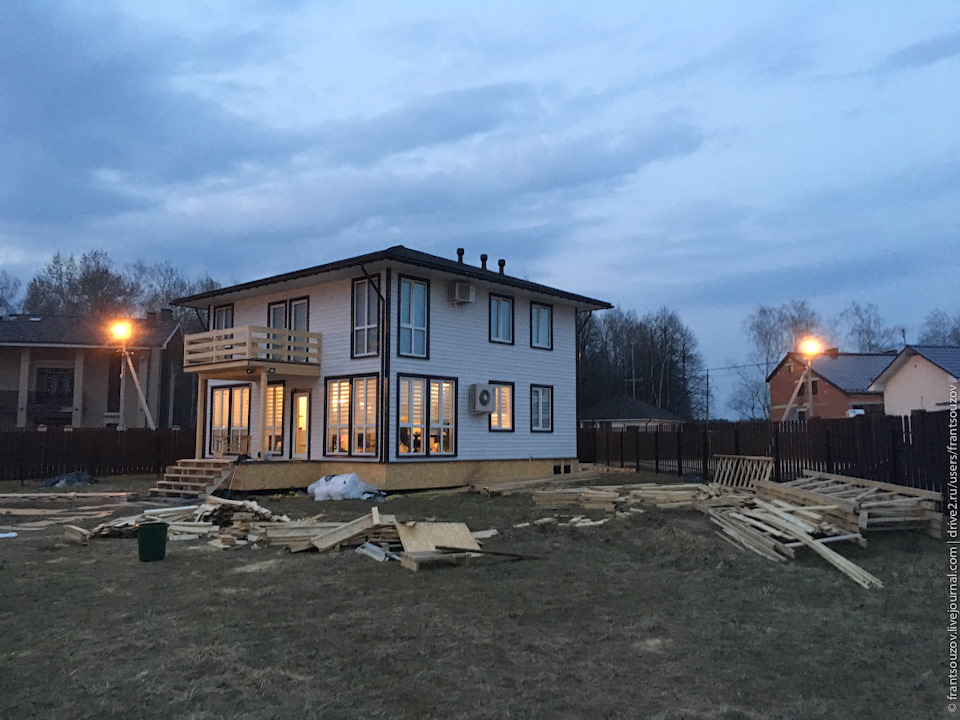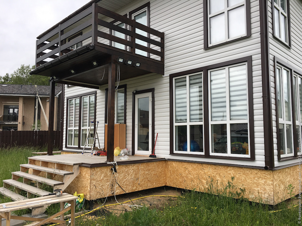 10. Тем временем потихоньку продолжаем приводить дом в порядок. Обработал балконы и маленькое крыльцо коричневой влагостойкой пропиткой в три слоя. Основное крыльцо пока оставил так, не знаю, что с ним делать. По идее надо бы покрывать коричневой террасной доской. Сделал уличный свет — теперь даже вечером на участке комфортно находиться. Шесть диодных прожекторов по 50 ватт каждый. Из них 4 включаются по датчику движения, а остальные два "привязаны" к моей самодельной охранной системе и являются автономными. Если в посёлке отключают электричество, в доме и на улице часть освещения продолжает работать. Ну и, конечно же, все шесть можно включить при помощи радиопульта. Еще сделал вывел уличные розетки на крыльцо и сделал декоративную подсветку и водосток.